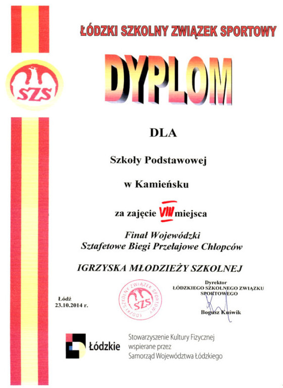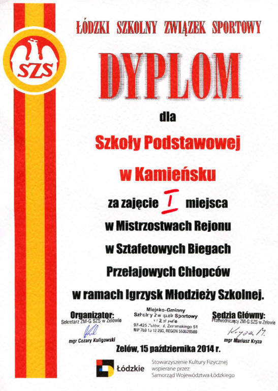 W dniu 23 października 2014 roku w parku im. Baden Powella w Łodzi odbył się Finał Wojewódzki w Sztafetowych Biegach Przełajowych. Zespół z PSP w Kamieńsku zajął wysokie VIII miejsce. Gratulujemy!