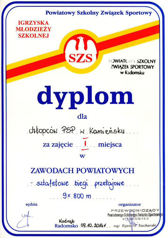 Drużyna chłopców z PSP w Kamieńsku, której opiekunem jest nauczyciel wychowania fizycznego Jarosław Kowalski wystąpiła w składzie: Piotr Górny, Dariusz Strzelecki, Sebastian Matuszczak, Artur Klekociński, Łukasz Stefanek, Mateusz Alama, Hubert Śnieg, Hubert Madejczyk, Paweł Szulc, Filip Wieczorek, Łukasz Turlejski, Mateusz Kołodziejczyk zajmując I miejsce uzyskała awans do Mistrzostw Rejonu Bełchatowskiego.