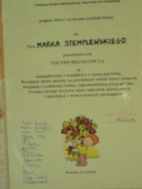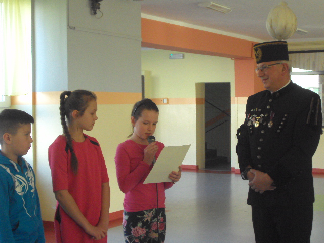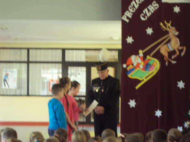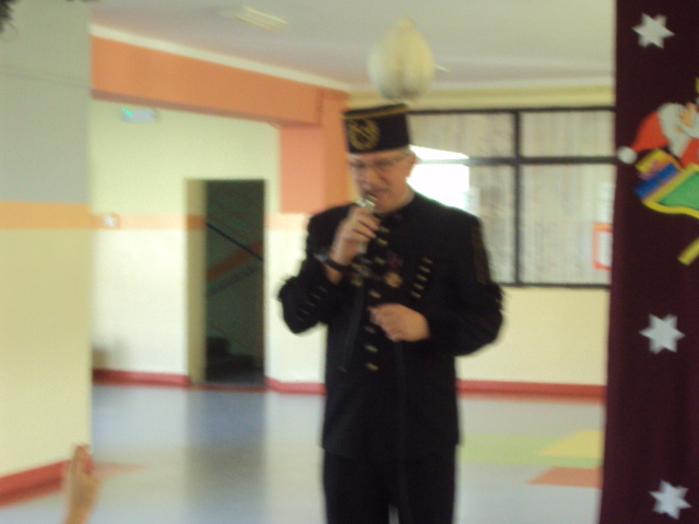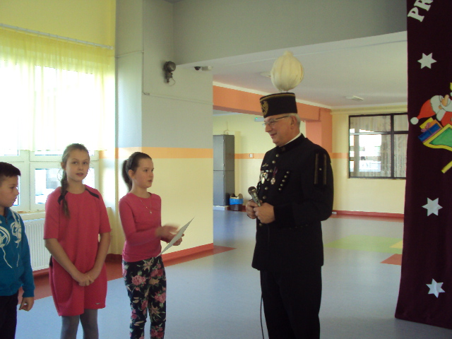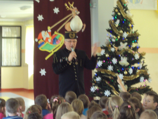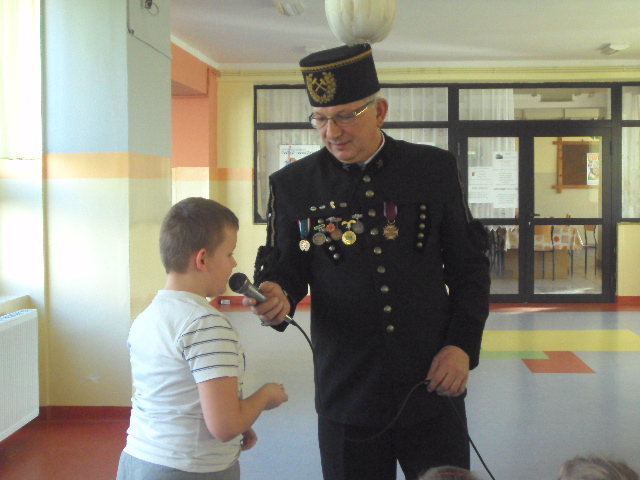 Dnia 4 grudnia naszą szkołę odwiedził niecodzienny gość. Był nim górnik Pan Marek Stemplewski - pracownik Kopalni Węgla Brunatnego w Bełchatowie. Pan górnik zapoznał uczniów z tradycją obchodów Barbórki, dokładnie opisał na czym polega praca górnika oraz opowiedział o stroju galowym. Dzieci były zafascynowane górniczym mundurem galowym gościa i z dociekliwością dopytywały o wszystkie jego szczegóły. Na zakończenie uczniowie podziękowali górnikowi wręczając laurkę. Spotkanie zakończyło się słodką niespodzianką przygotowaną przez gościa.