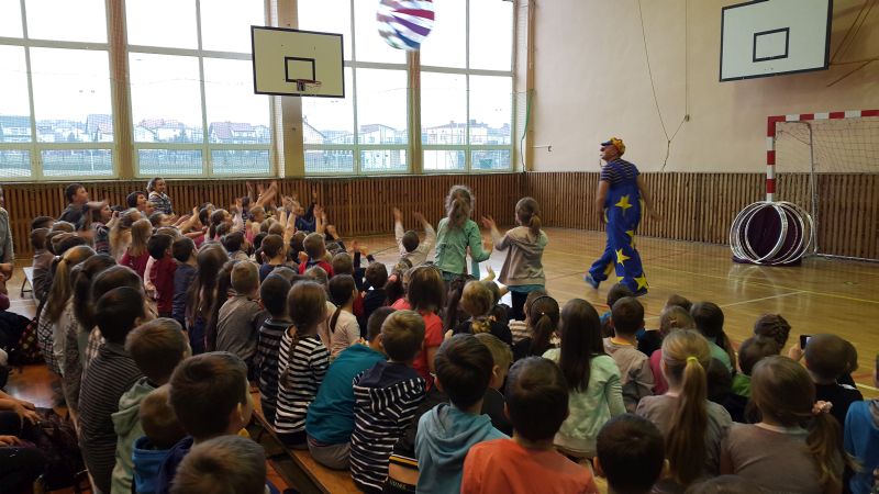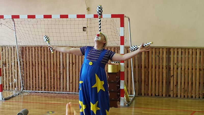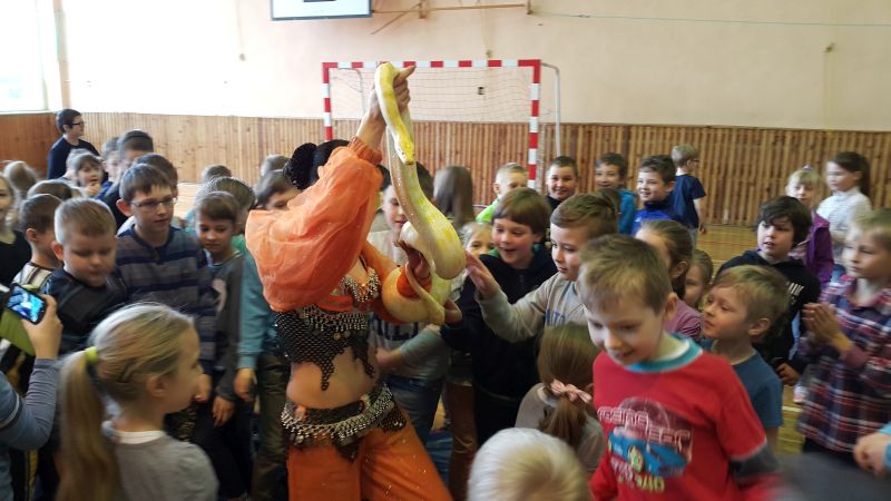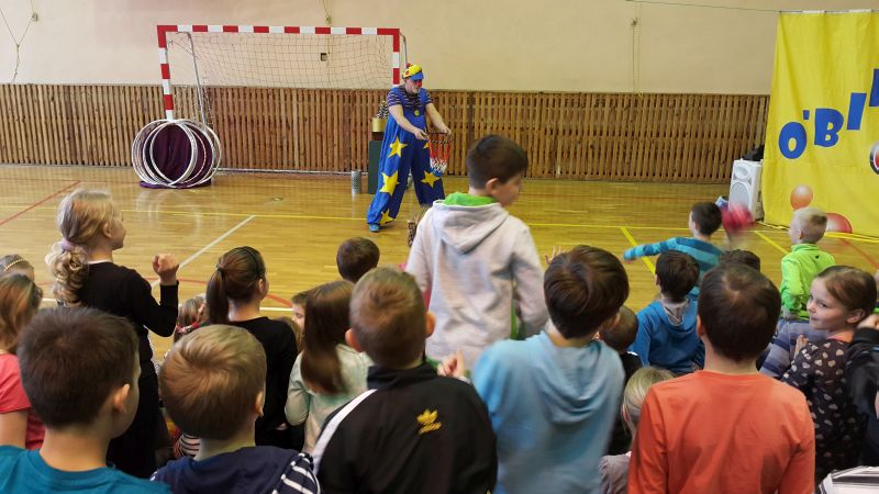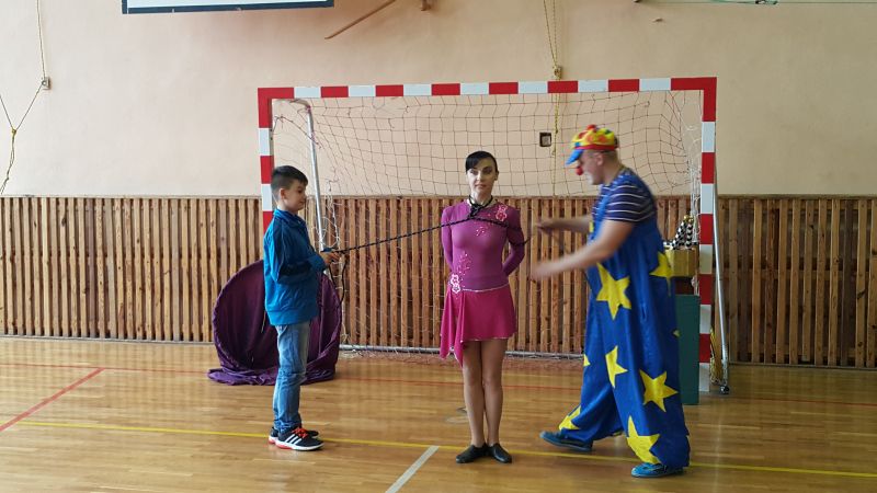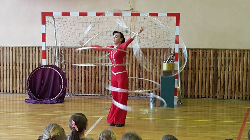 Objazdowa grupa cyrkowa "O’BIMBOLANDO” odwiedziła dziś naszą szkołę. Uczniowie z ogromnym entuzjazmem oglądali przedstawiony program. Można było zobaczyć pokaz żonglerki, popis z obręczami oraz tresurę pieska. Niektórzy widzowie mogli wypróbować swoich umiejętności w poszczególnych dyscyplinach. Spośród publiczności zostali wybrani ochotnicy do wzięcia udziału w przedstawieniu. Pełni zapału, z różnym skutkiem, próbowali dotrzymać kroku zawodowcom. Dzieciom najbardziej jednak podobał się bardzo zabawny clown oraz wąż, którego mogły nawet dotknąć. Umiejętności cyrkowców wszystkim bardzo się podobały, o czym świadczyły burzliwe oklaski po każdym pokazie. Było dużo śmiechu i zabawy.