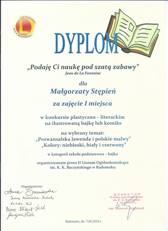 W dniu 7 kwietnia 2016 roku w II Liceum Ogólnokształcącym w Radomsku odbyła się uroczysta gala zakończenia wymiany polsko-francuskiej. Z tej okazji zostały wręczone nagrody w konkursie plastyczno-literackim na ilustrowaną bajkę lub komiks. W kategorii bajka – szkoła podstawowa I miejsce zajęła uczennica klasy VIb Małgorzata Stępień. Małgosia napisała bajkę pod tytułem „Prowansalska lawenda i polskie malwy” oraz stworzyła do niej ilustrację.