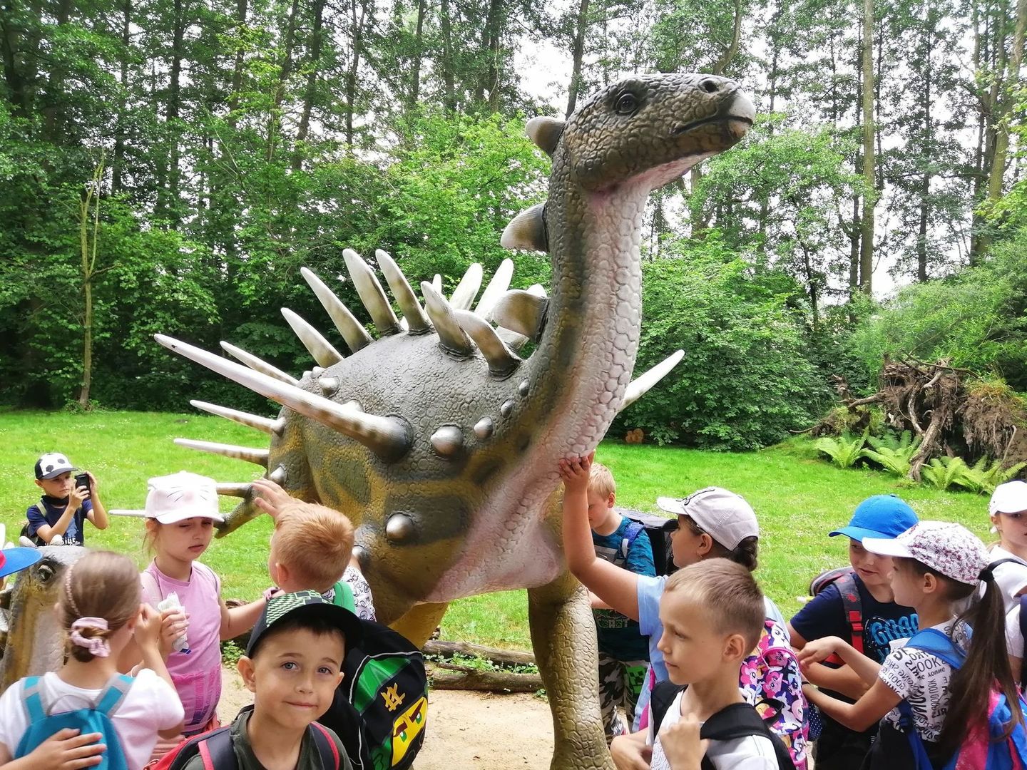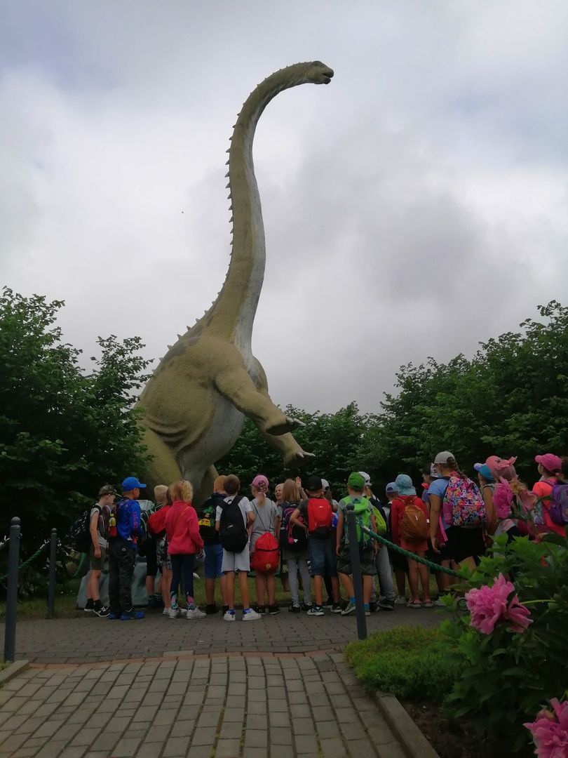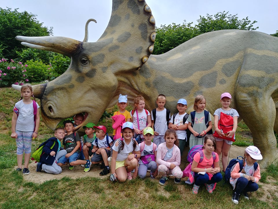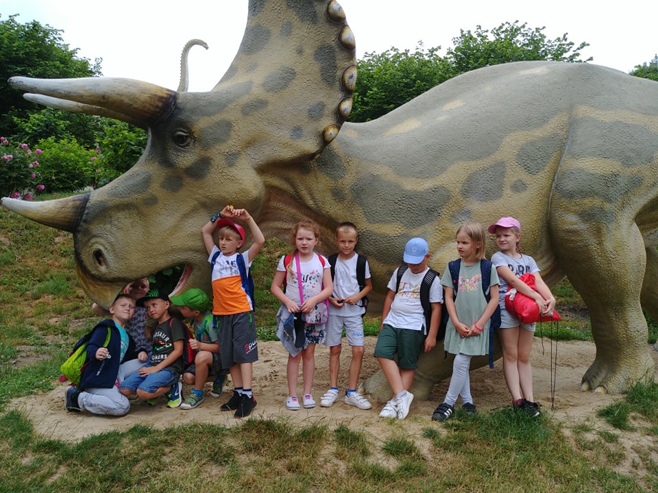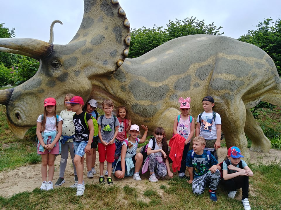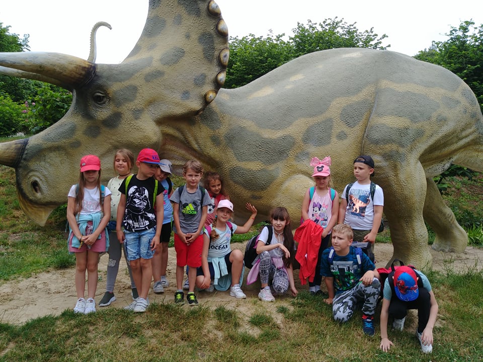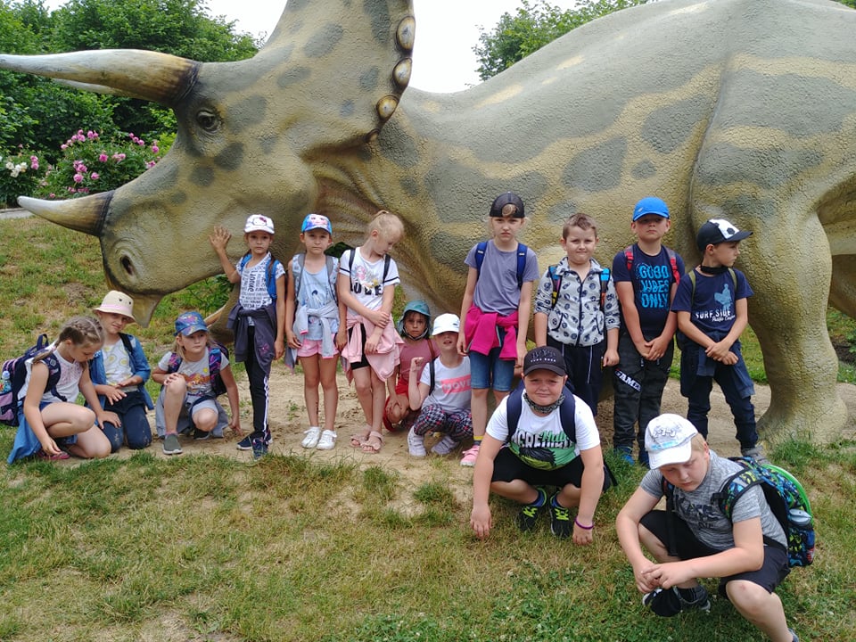 W dniu 23 czerwca 2021r. uczniowie klas I uczestniczyli w wycieczce do Dinoparku w Kołacinku. Wyjazd był sfinansowany ze środków Wojewódzkiego Funduszu Ochrony Środowiska i Gospodarki Wodnej w Łodzi w ramach realizacji projektu "By w przyszłych stuleciach nie utonąć w śmieciach". W trakcie wycieczki uczniowie przeszli z przewodnikiem ścieżką ery mezozoicznej. Zobaczyli figury dinozaurów w naturalnej wielkości oraz dowiedzieli się wielu ciekawostek z życia tych zwierząt. Zwiedzili wystawę geologiczno-paleontologiczną. Uczestniczyli również w spacerze Bajkową Ścieżką, gdzie pani przewodnik przypomniała treść i morały płynące z bajek i baśni. Podczas wycieczki nie zabrakło też wspaniałej zabawy w figloraju oraz zakupu pamiątek w sklepiku. Po okresie zdalnej nauki była to wspaniała chwila na integrację pierwszaków. Wszyscy wrócili zadowoleni i uśmiechnięci.