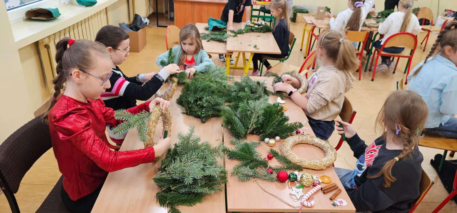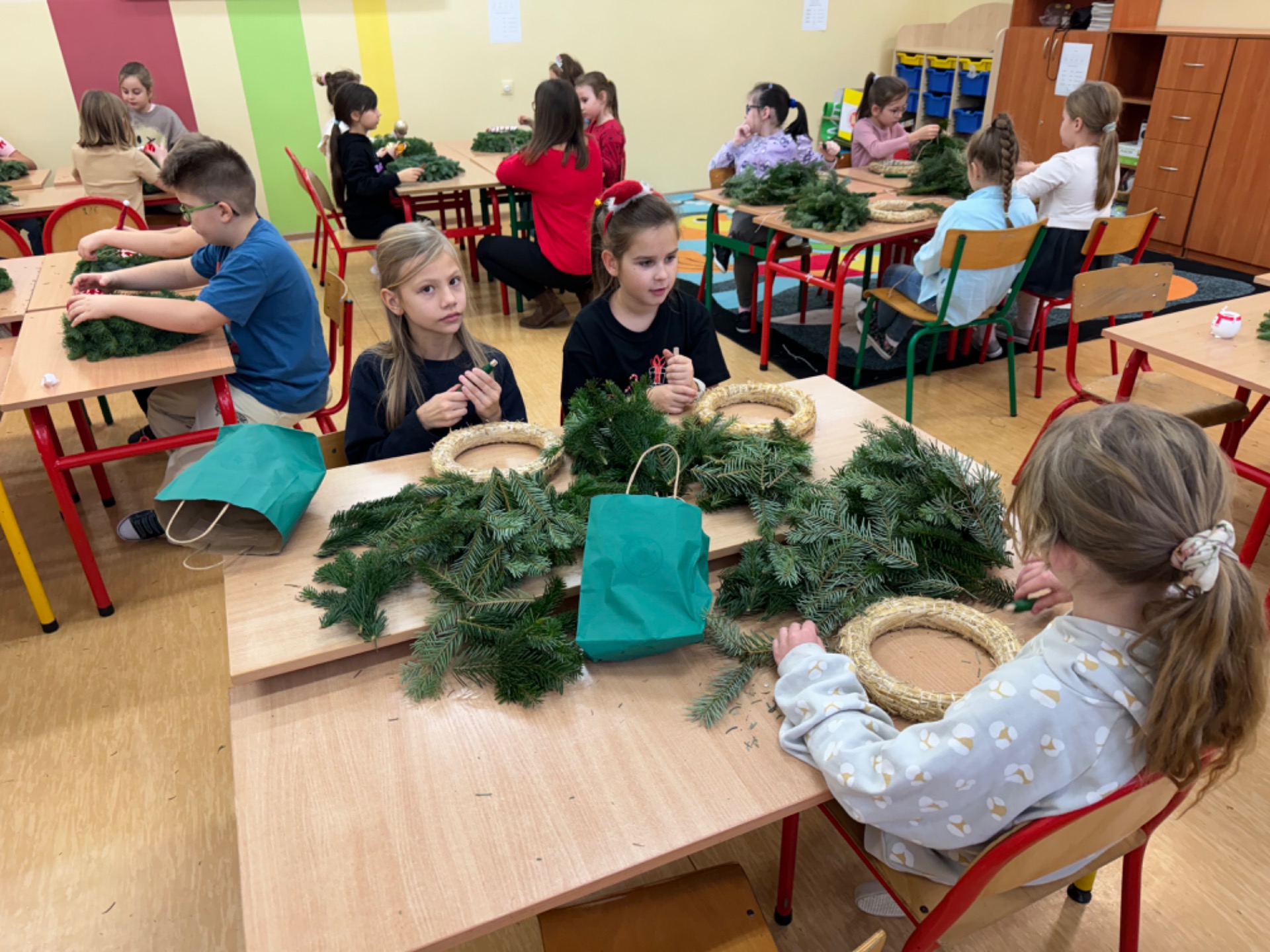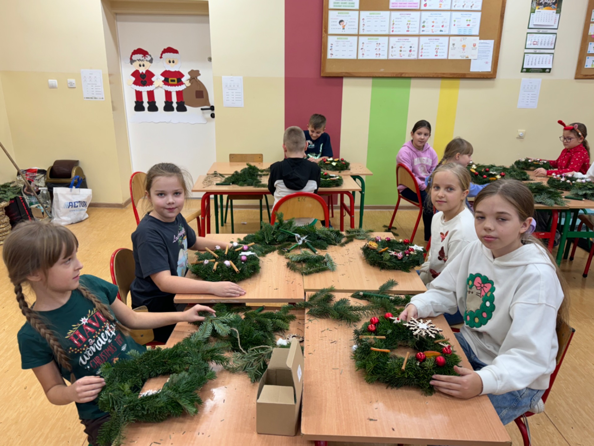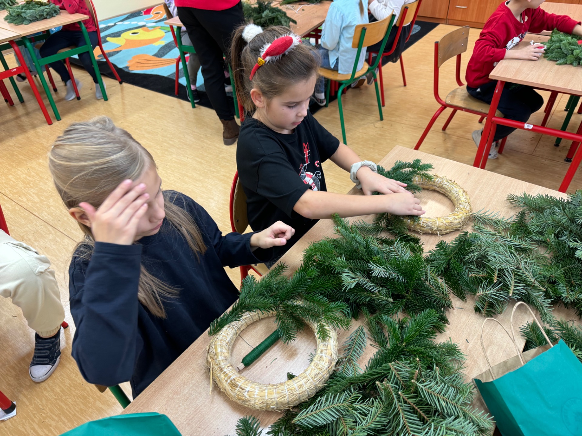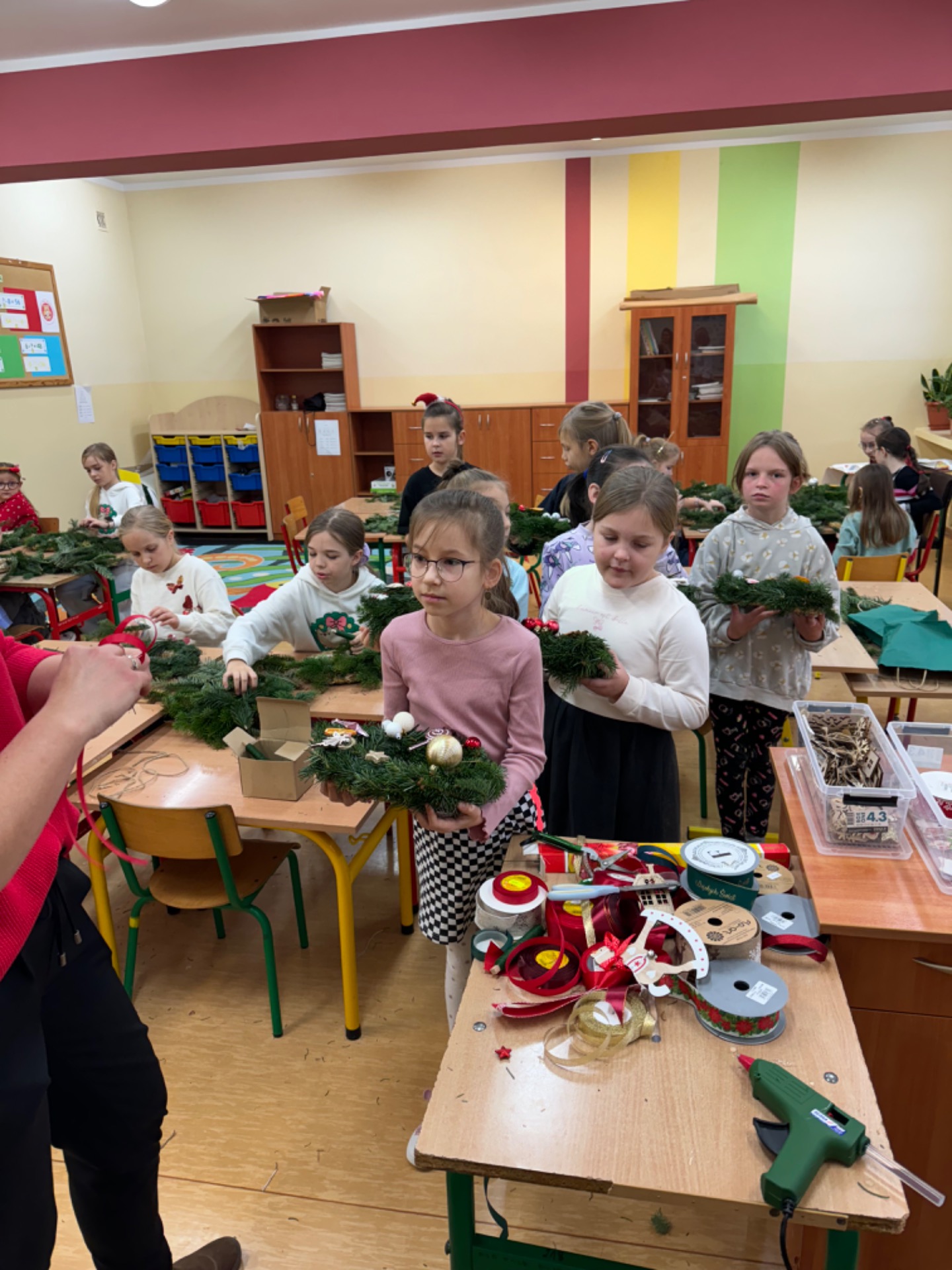 Dziś uczniowie edukacji wczesnoszkolnej mieli okazję uczestniczyć w wyjątkowych warsztatach tworzenia wianków bożonarodzeniowych. Zajęcia miały na celu rozwijanie wyobraźni, zdolności manualnych oraz umiejętności współpracy w grupie.