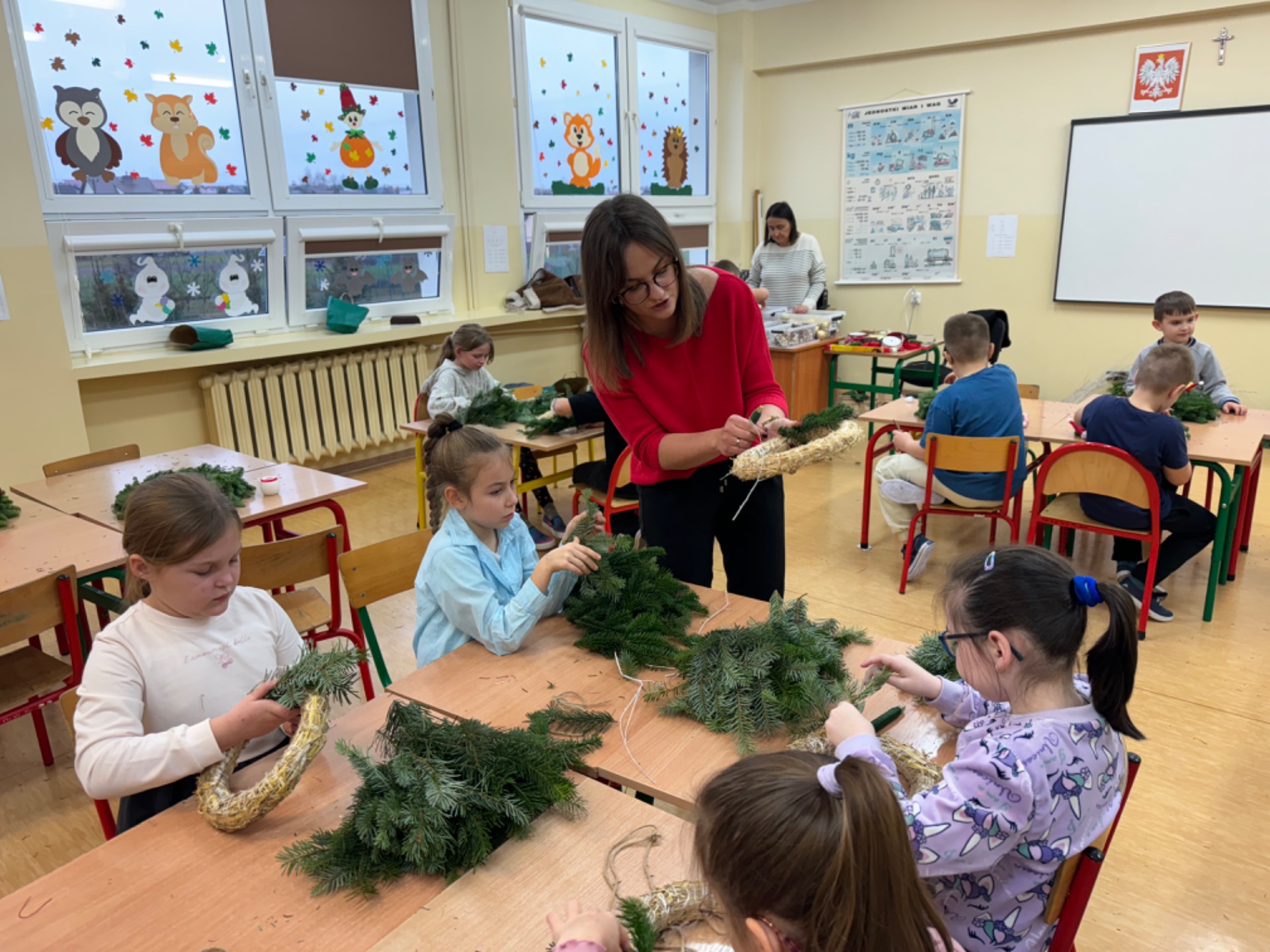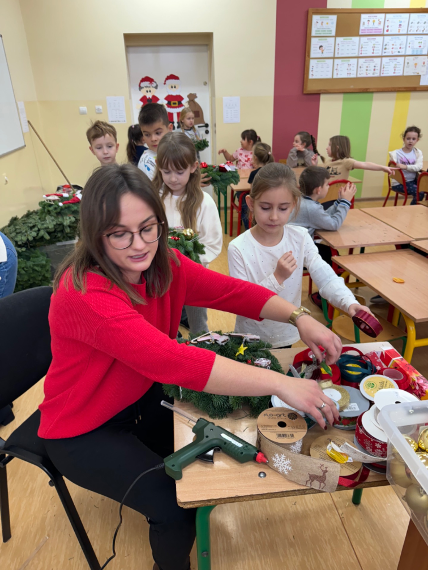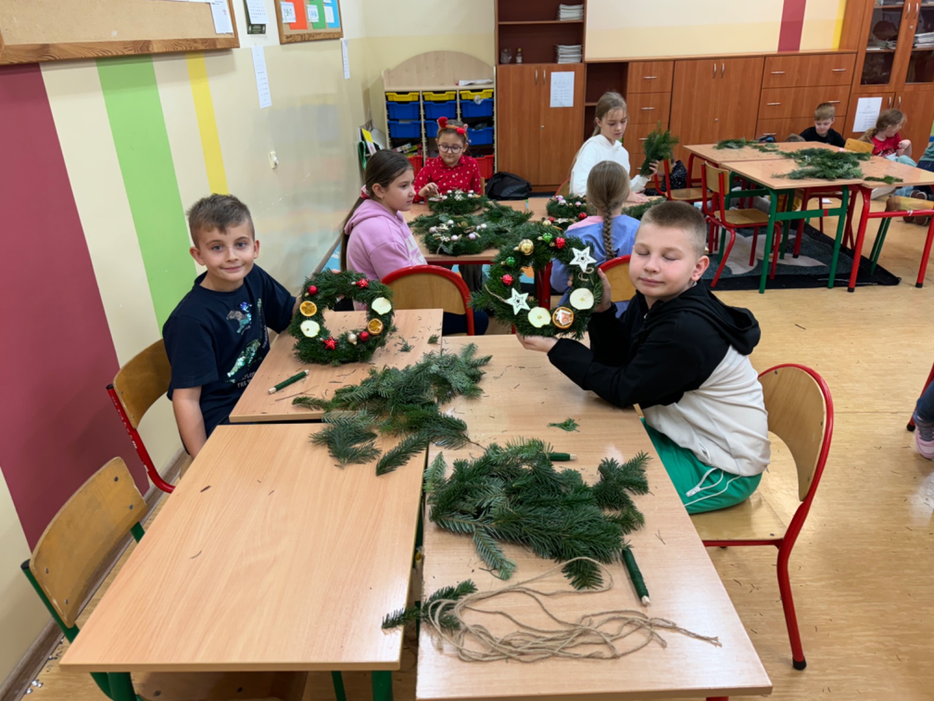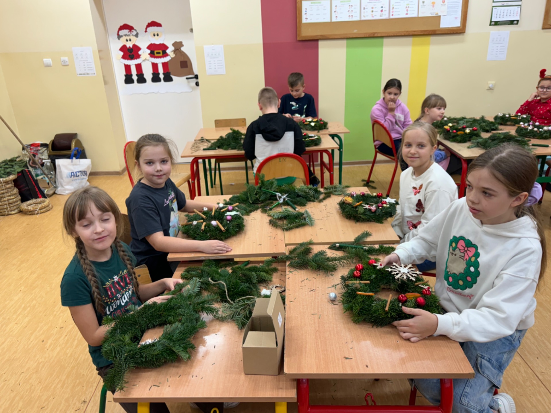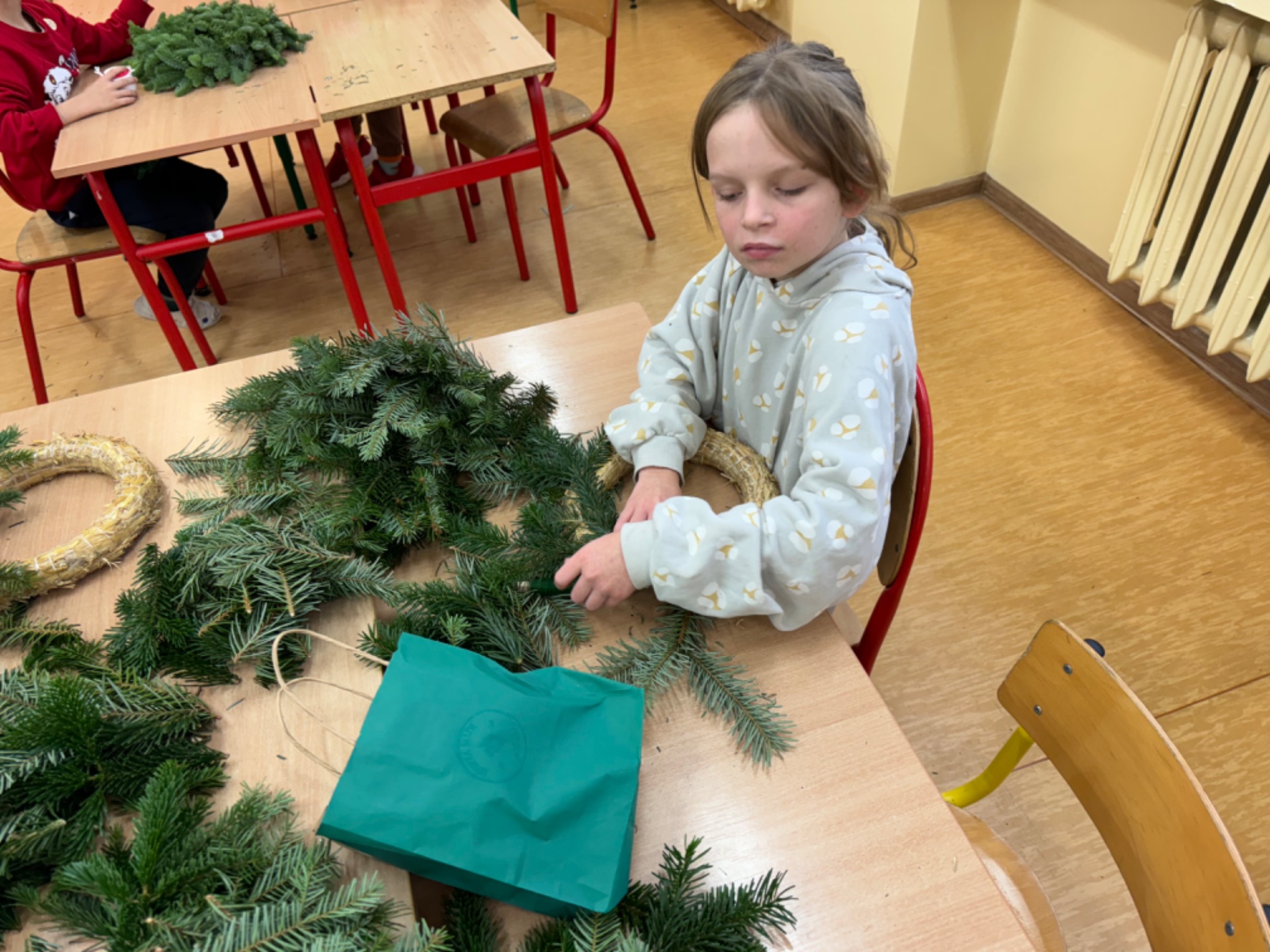Dziś uczniowie edukacji wczesnoszkolnej mieli okazję uczestniczyć w wyjątkowych warsztatach tworzenia wianków bożonarodzeniowych. Zajęcia miały na celu rozwijanie wyobraźni, zdolności manualnych oraz umiejętności współpracy w grupie.