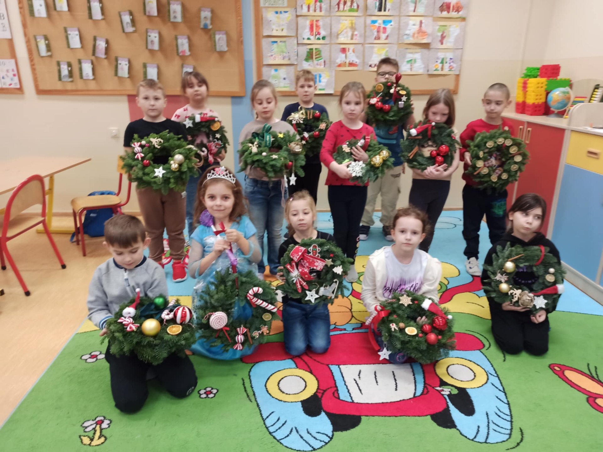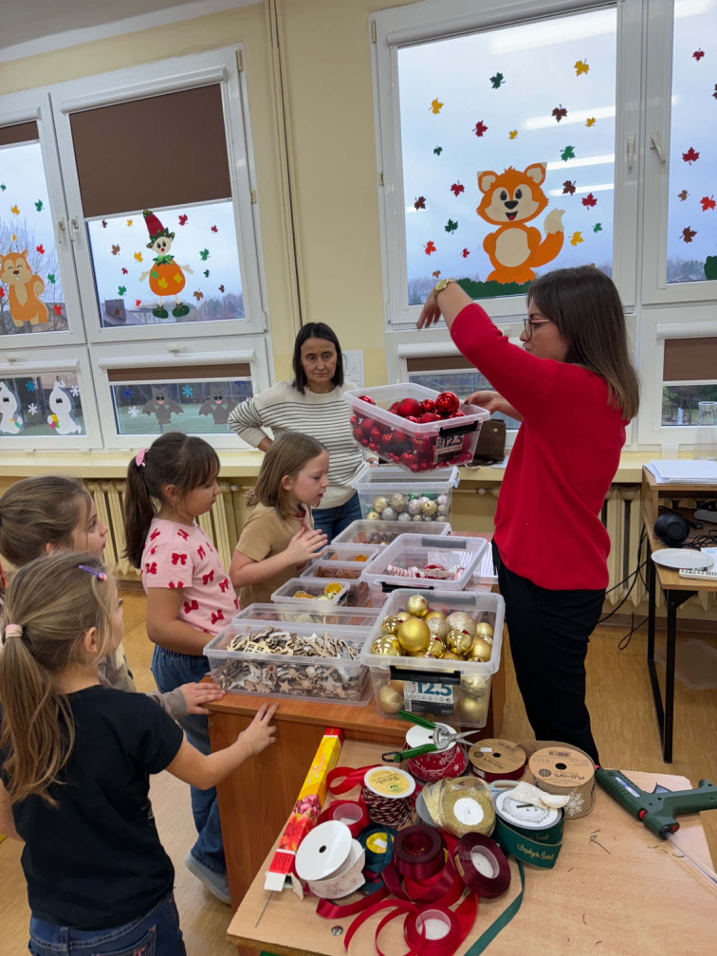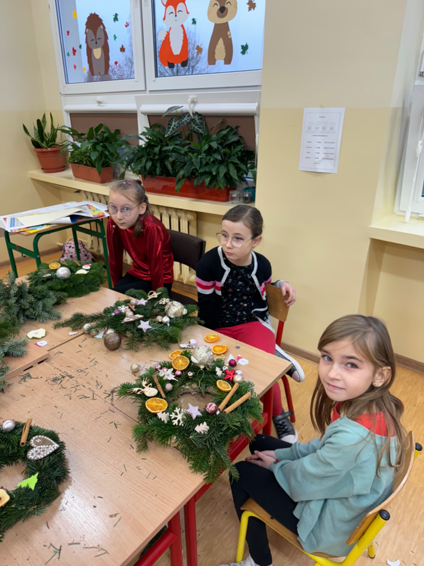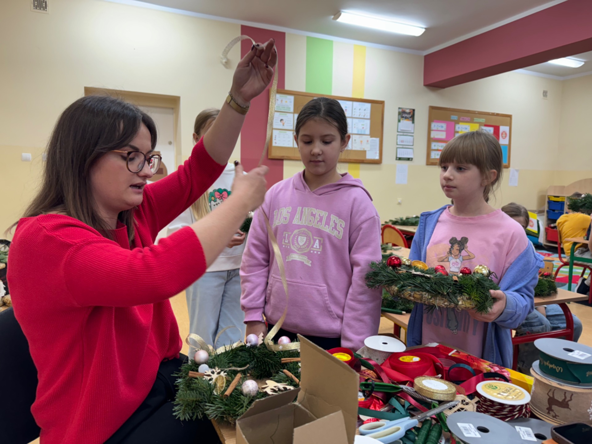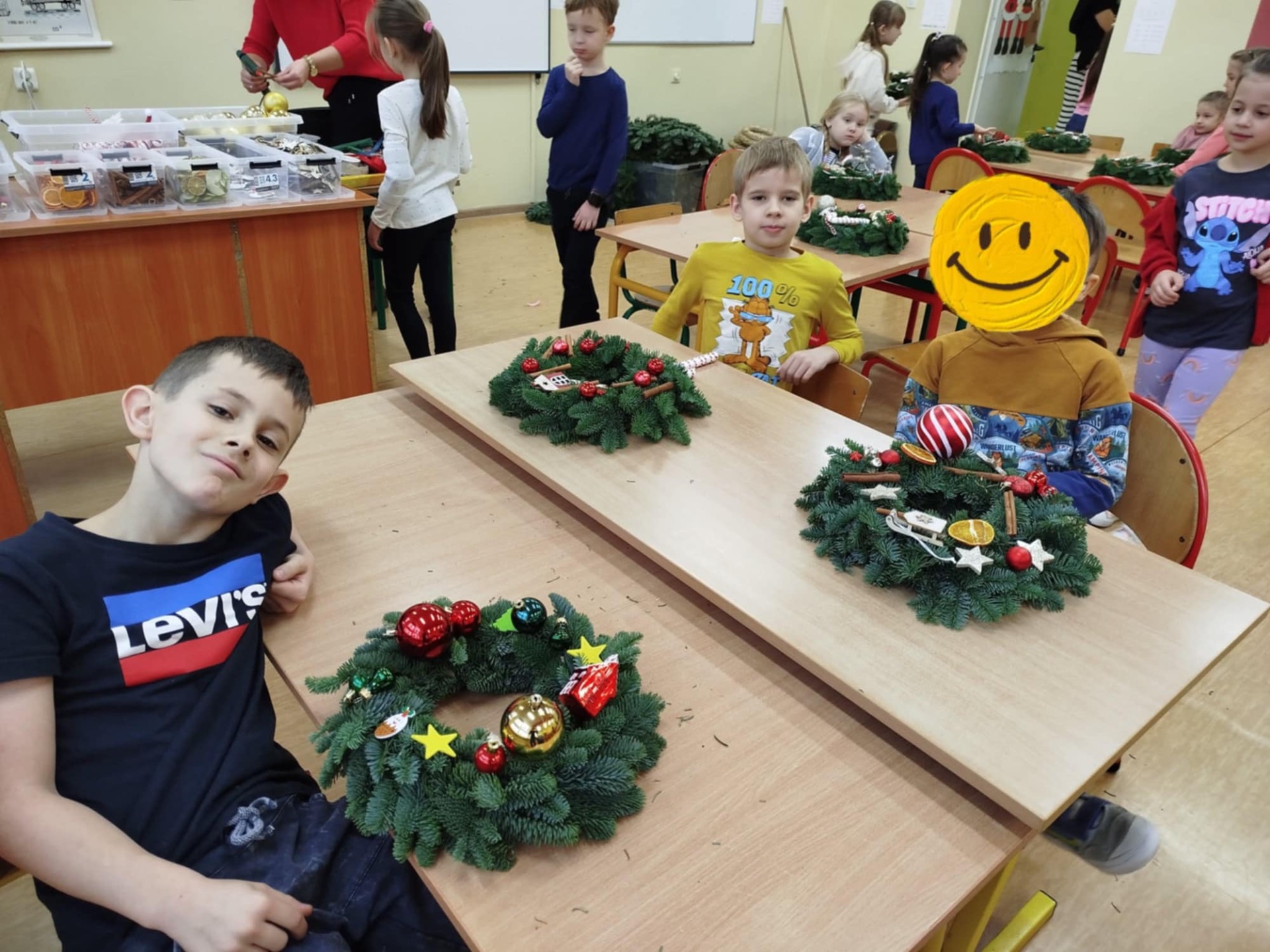 Podczas warsztatów uczniowie wykorzystali różnorodne materiały, takie jak bombki, wstążki i ozdoby, do tworzenia własnych, unikalnych kompozycji. Praca w grupach sprzyjała integracji i wspólnej twórczości, a efektem końcowym były piękne, kolorowe wianki, które uczniowie zabrali ze sobą do domu.