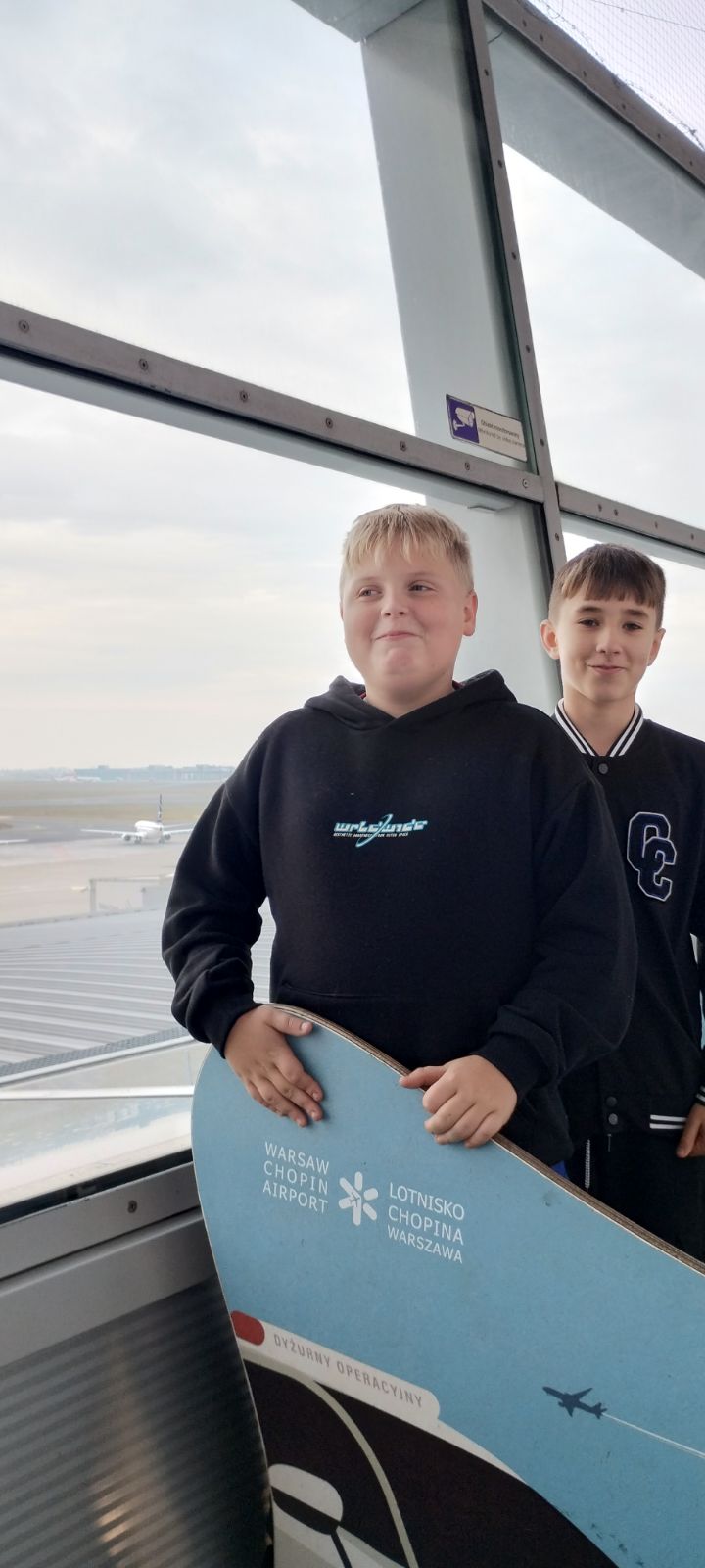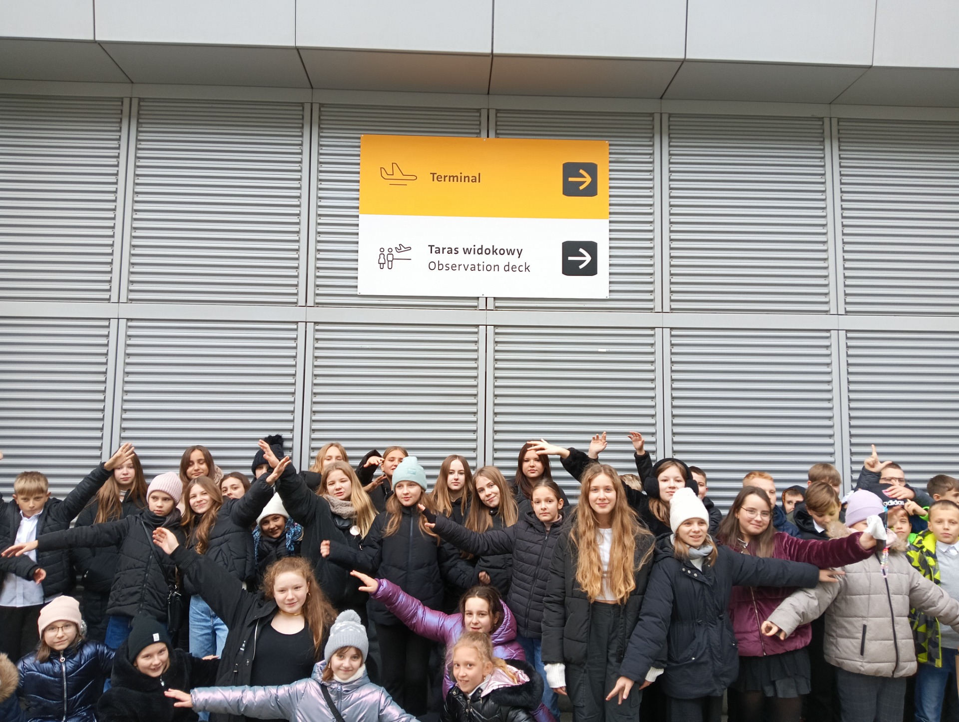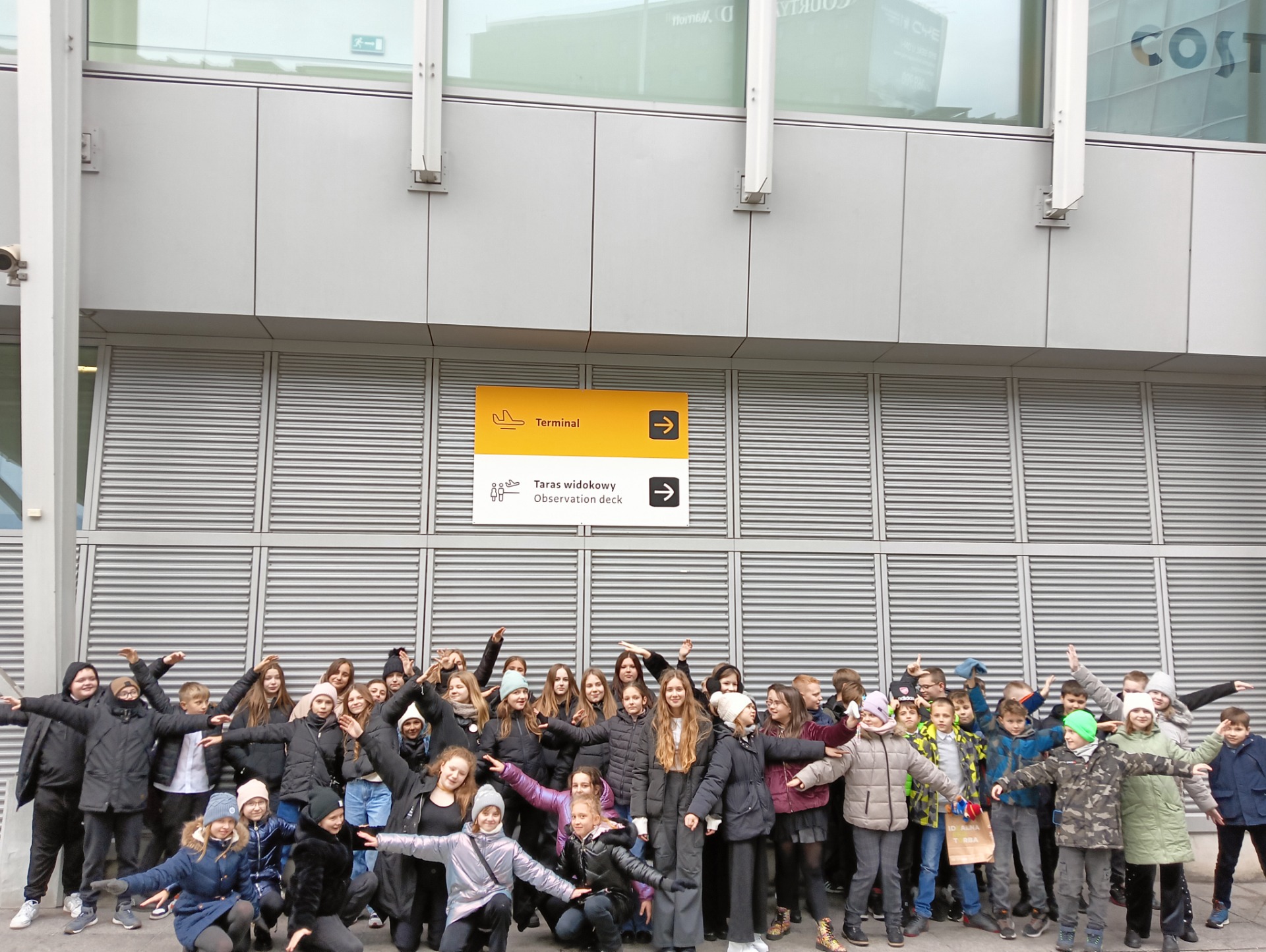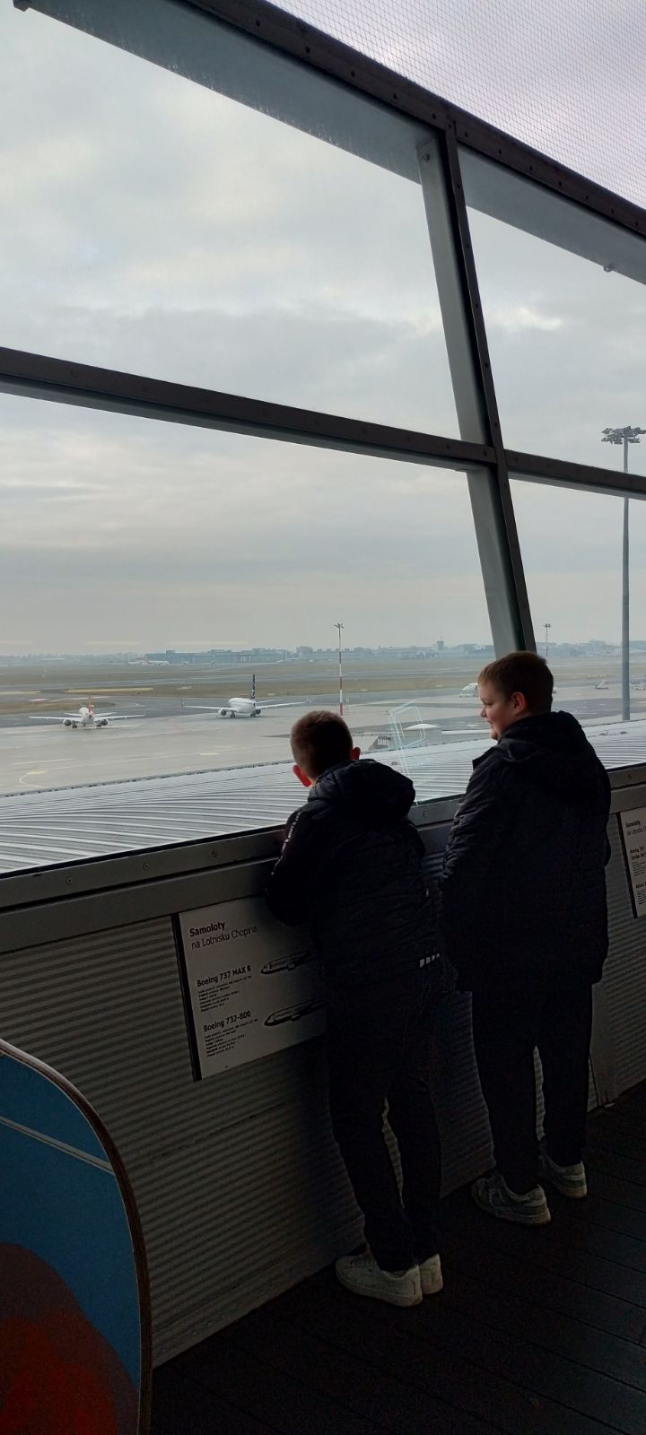 Pierwszym punktem naszej wycieczki był pobyt na Lotnisku im. F. Chopina. Uczniowie z tarasu widokowego obserwowali startujące i lądujące samoloty, robili pamiątkowe zdjęcia, kupowali pamiątki i planowali lot do Budapesztu, aby zobaczyć miejsca związane z omawianą lekturą Chłopcy z Placu Broni.