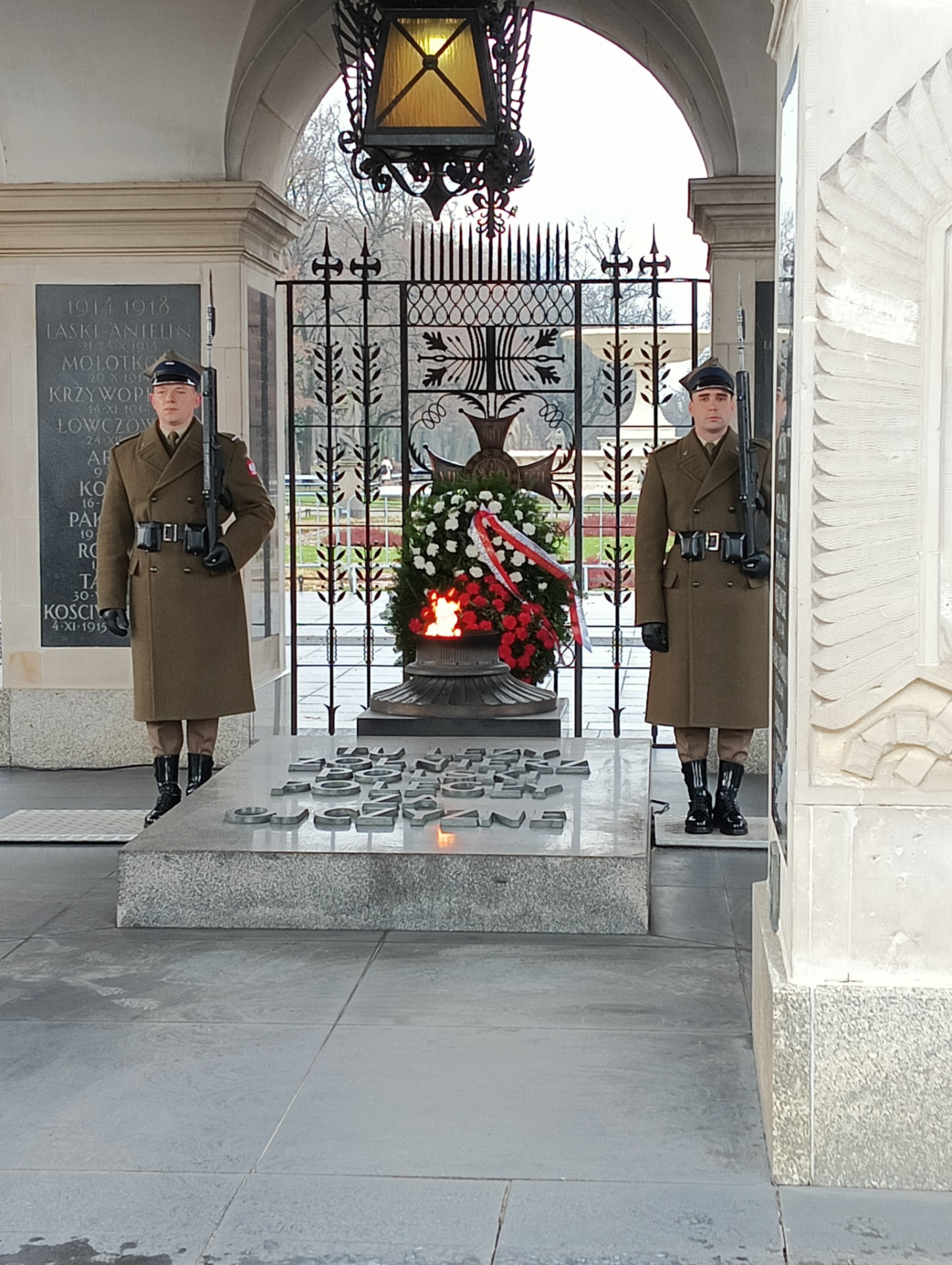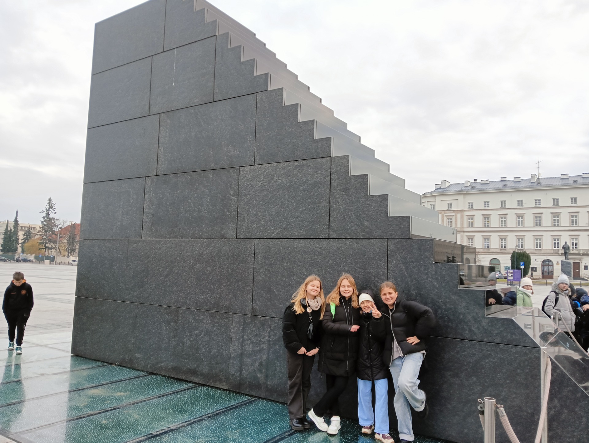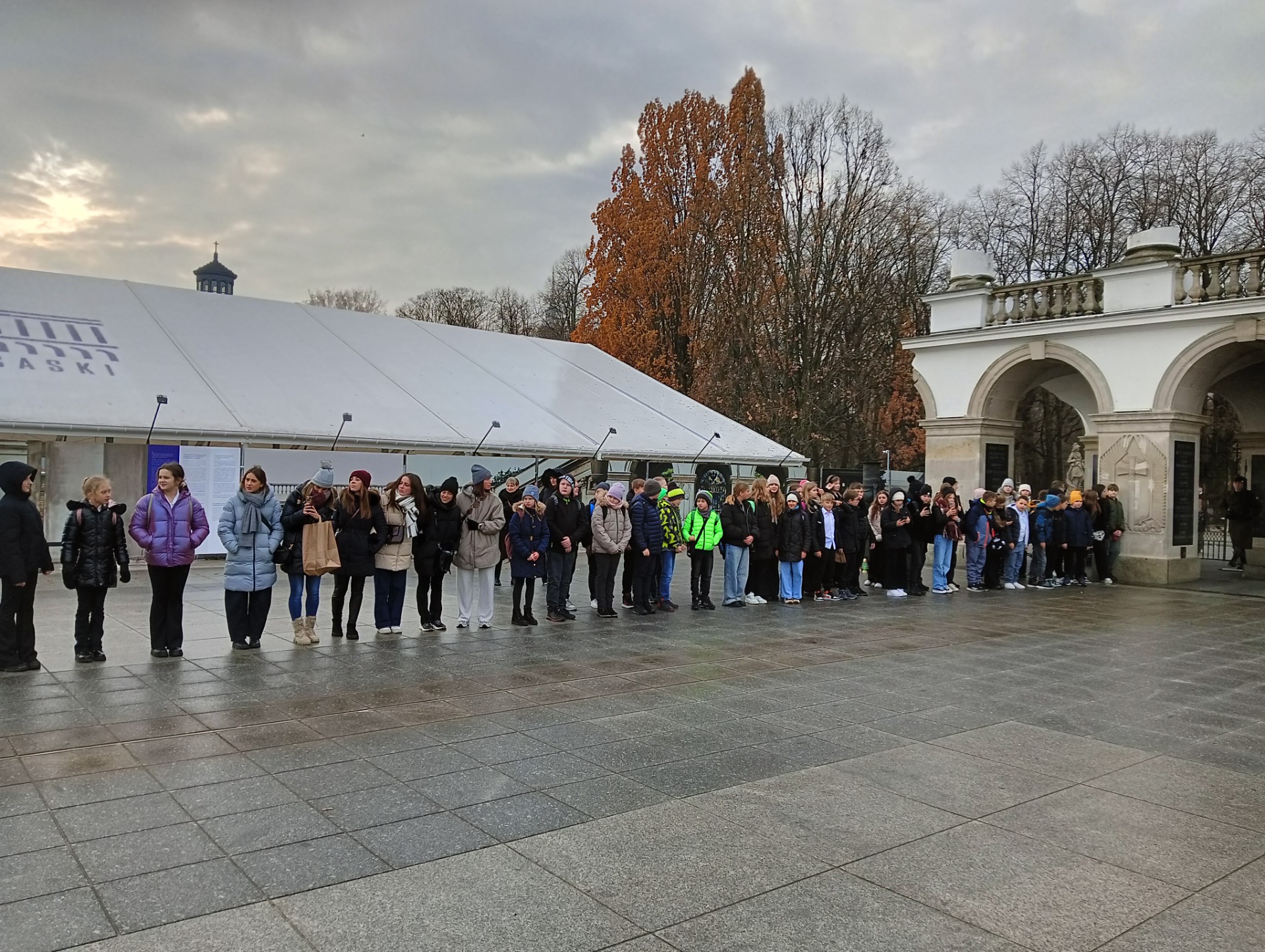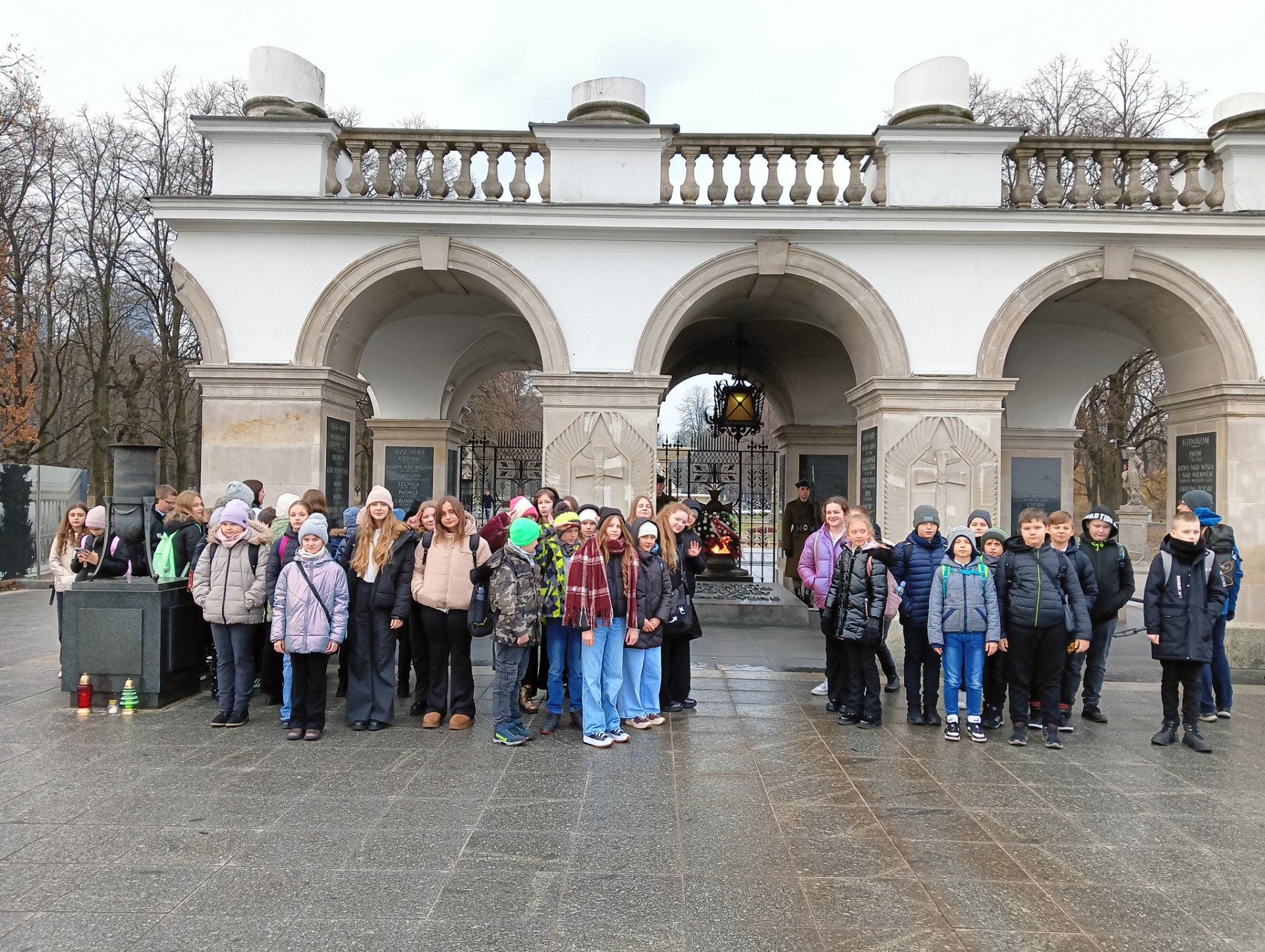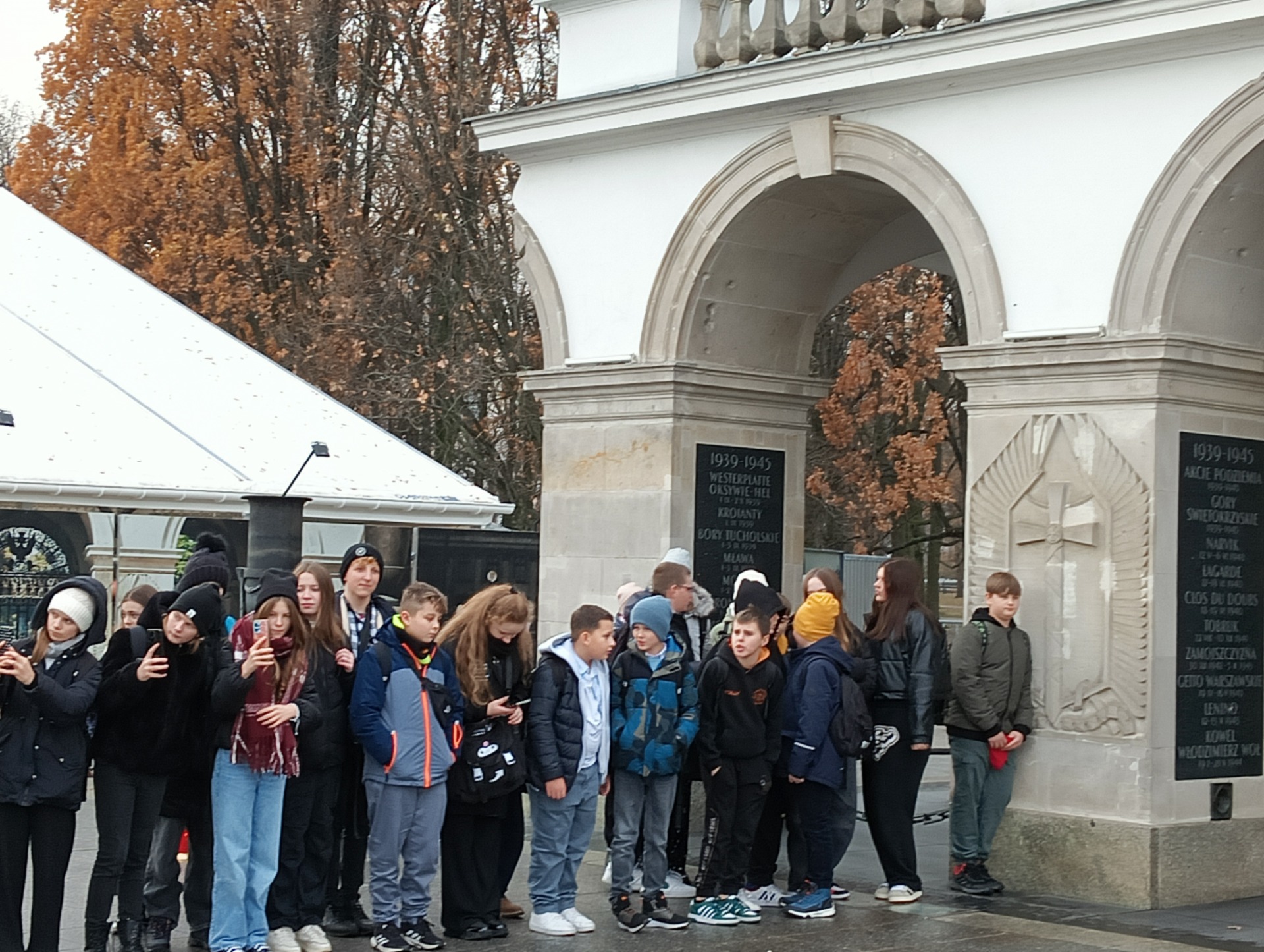 Następnie udaliśmy się do Grobu Nieznanego Żołnierza na placu Saskim, gdzie płonie wieczny znicz i służbę pełni warta honorowa. Mieliśmy okazję uczestniczyć w uroczystej zmianie warty Żołnierzy Batalionu Reprezentacyjnego Wojska Polskiego. Zobaczyliśmy również pomnik poświęcony ofiarom katastrofy smoleńskiej, o której opowiedział uczniom nauczyciel historii p. Marlena Mroczkowska-Madejczyk.