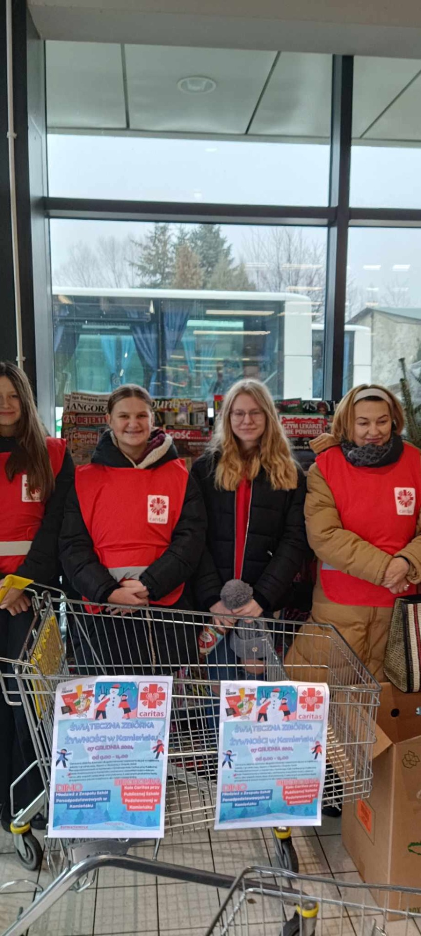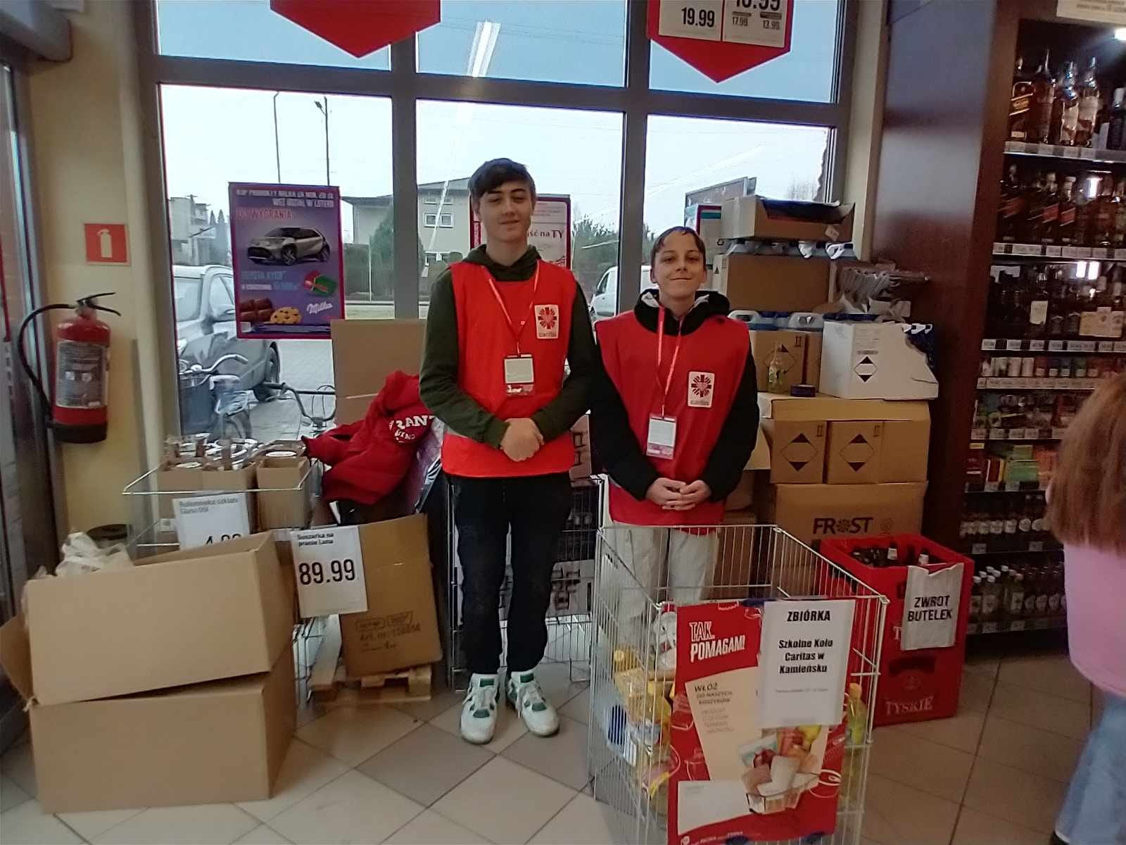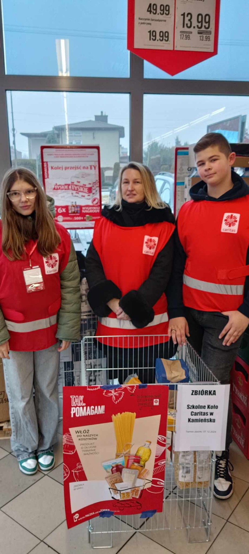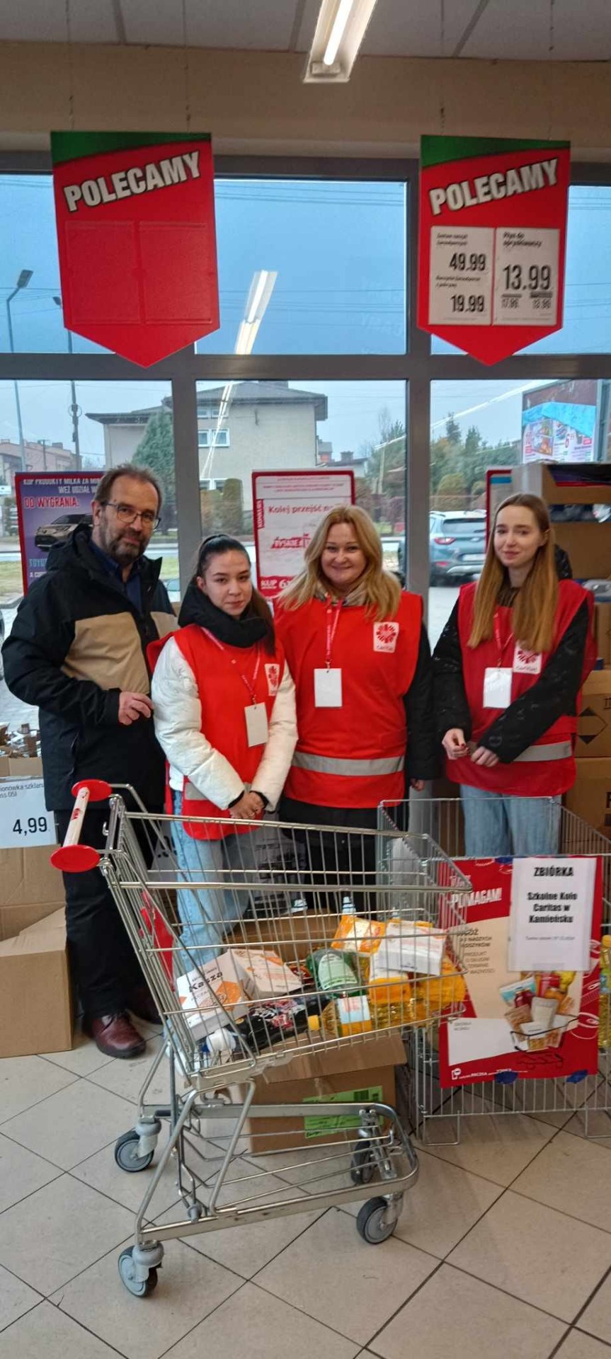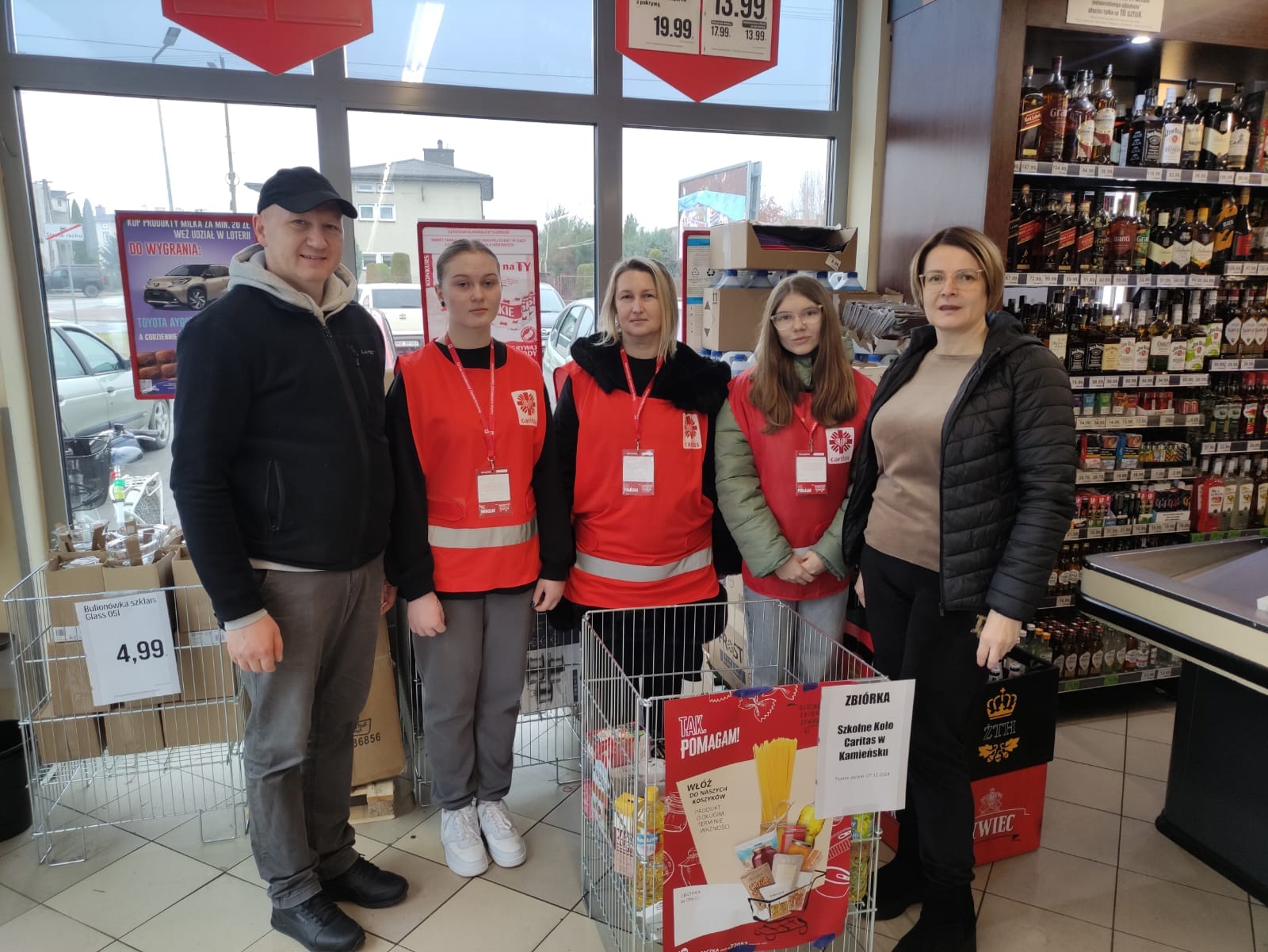 wraz z nauczycielami : p. Anna Baron, p. Renata Trzepańska i KS. Paweł Bil zbierała żywność i produkty długoterminowe przy markecie DINO w Kamieńsku.