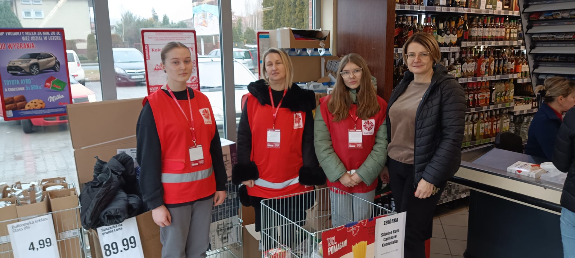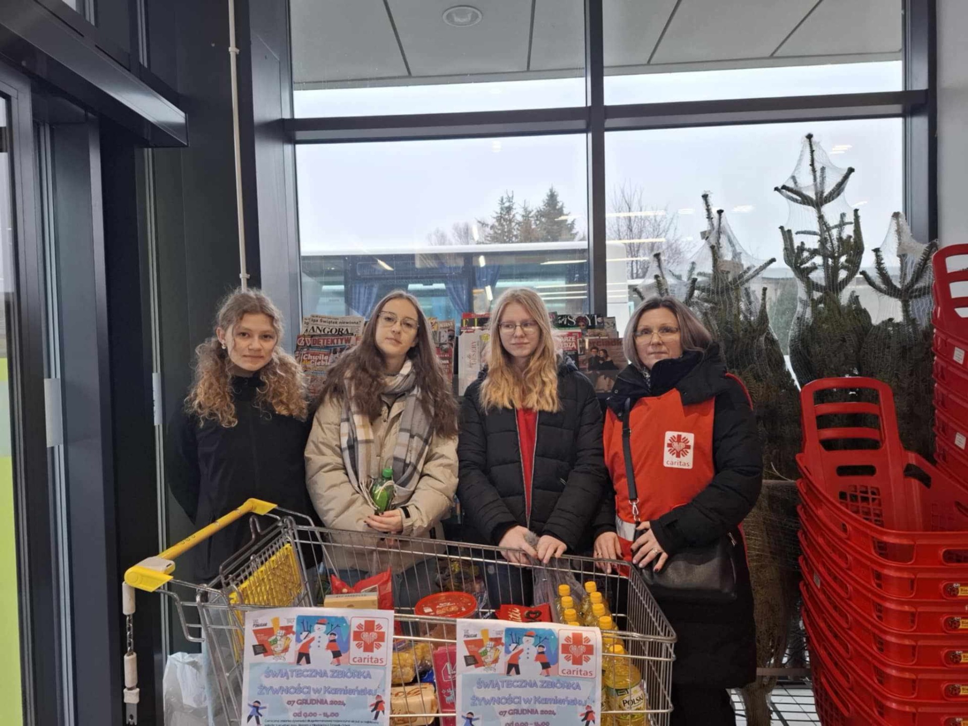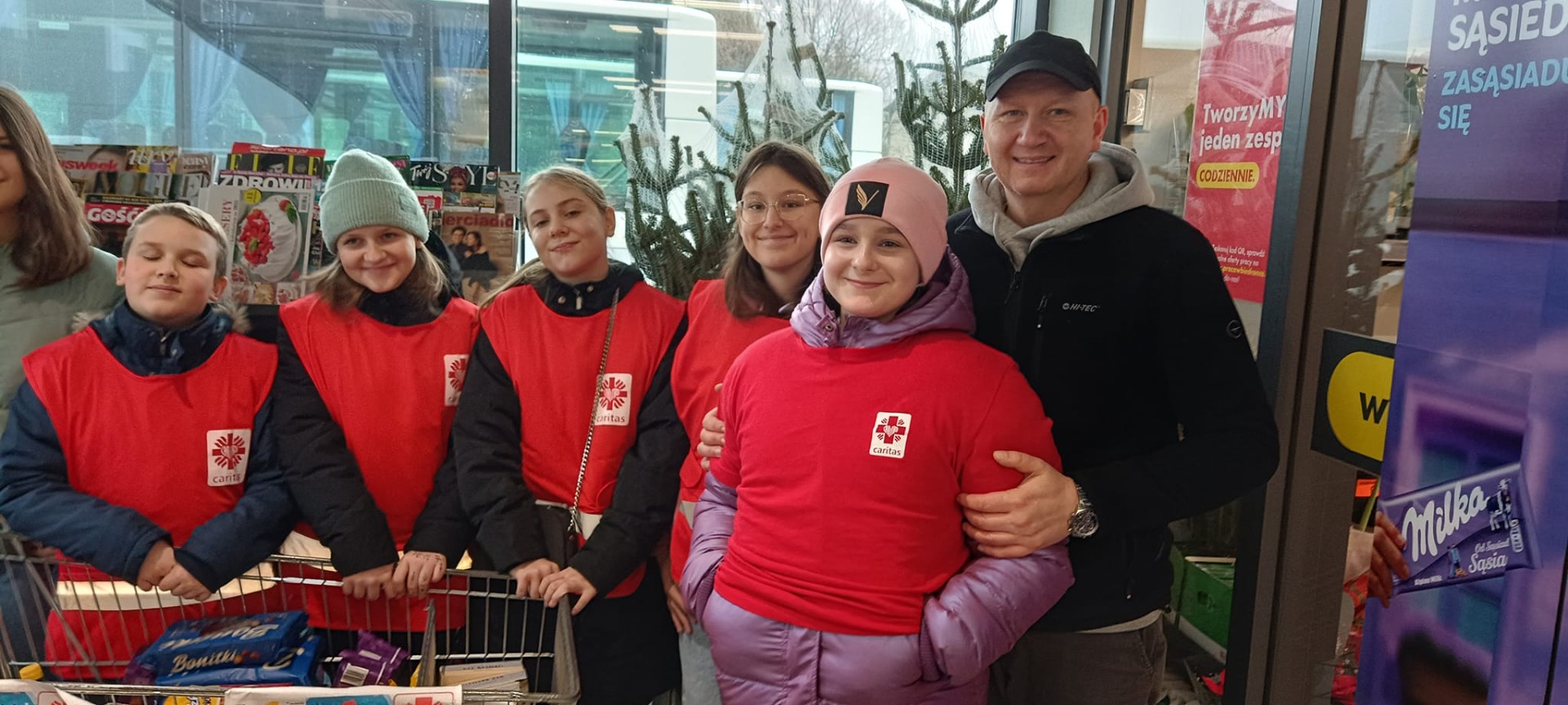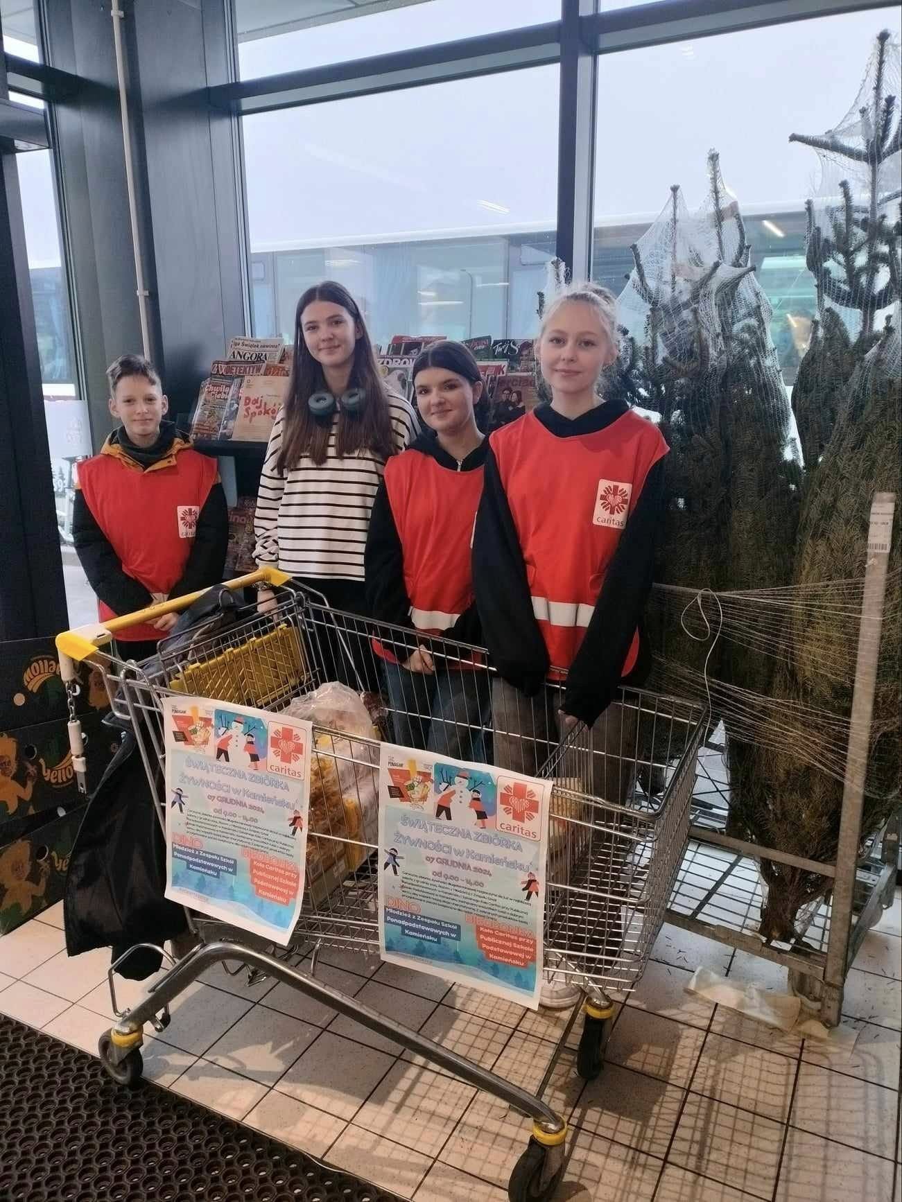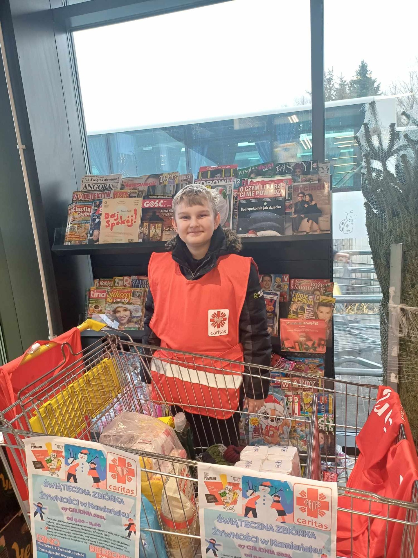 wraz z nauczycielami : p. Anna Baron, p. Renata Trzepańska i KS. Paweł Bil zbierała żywność i produkty długoterminowe przy markecie DINO w Kamieńsku.