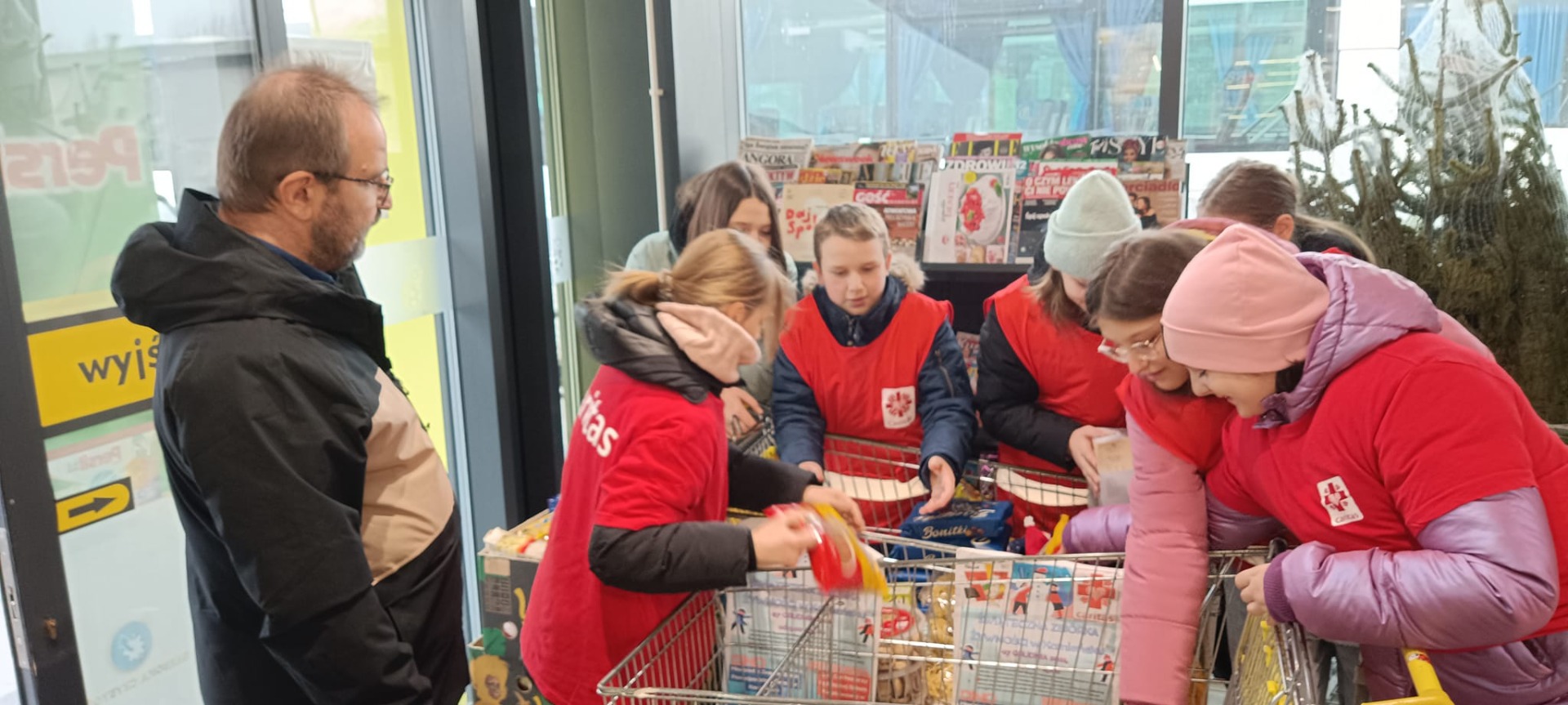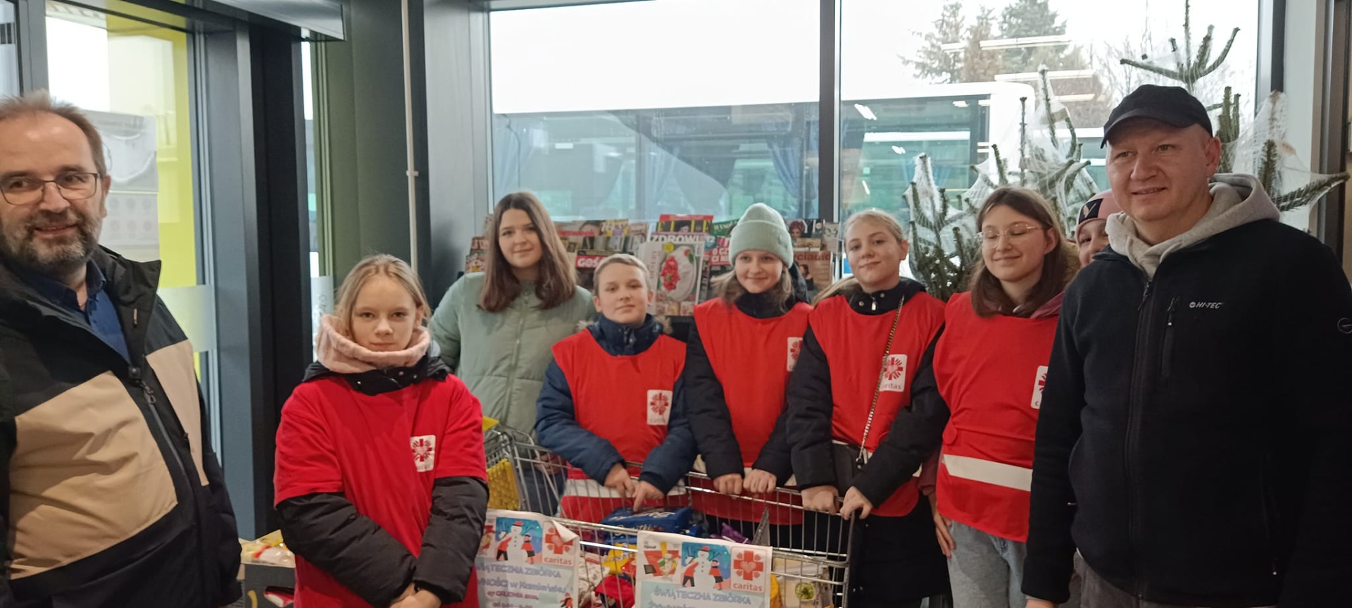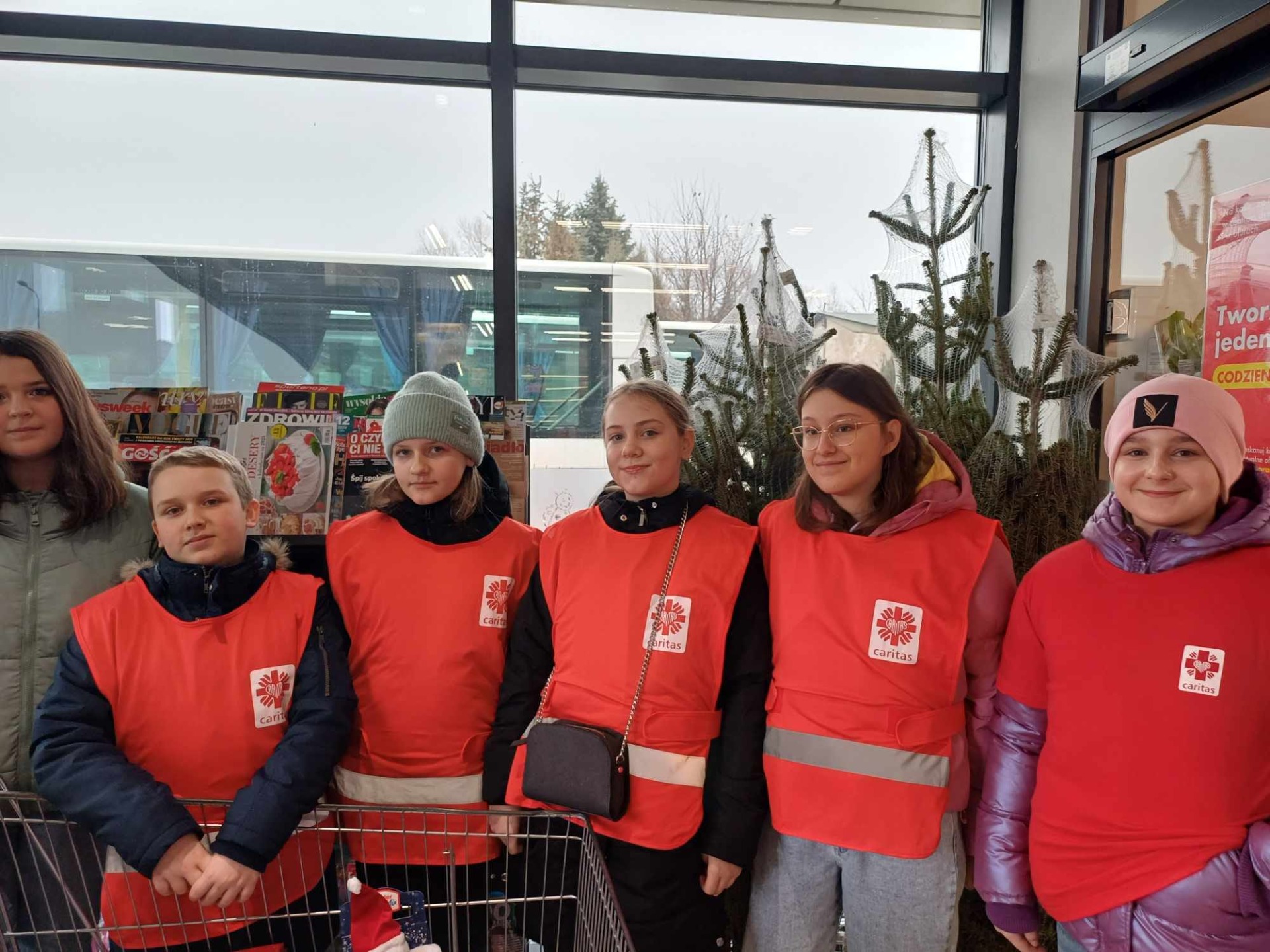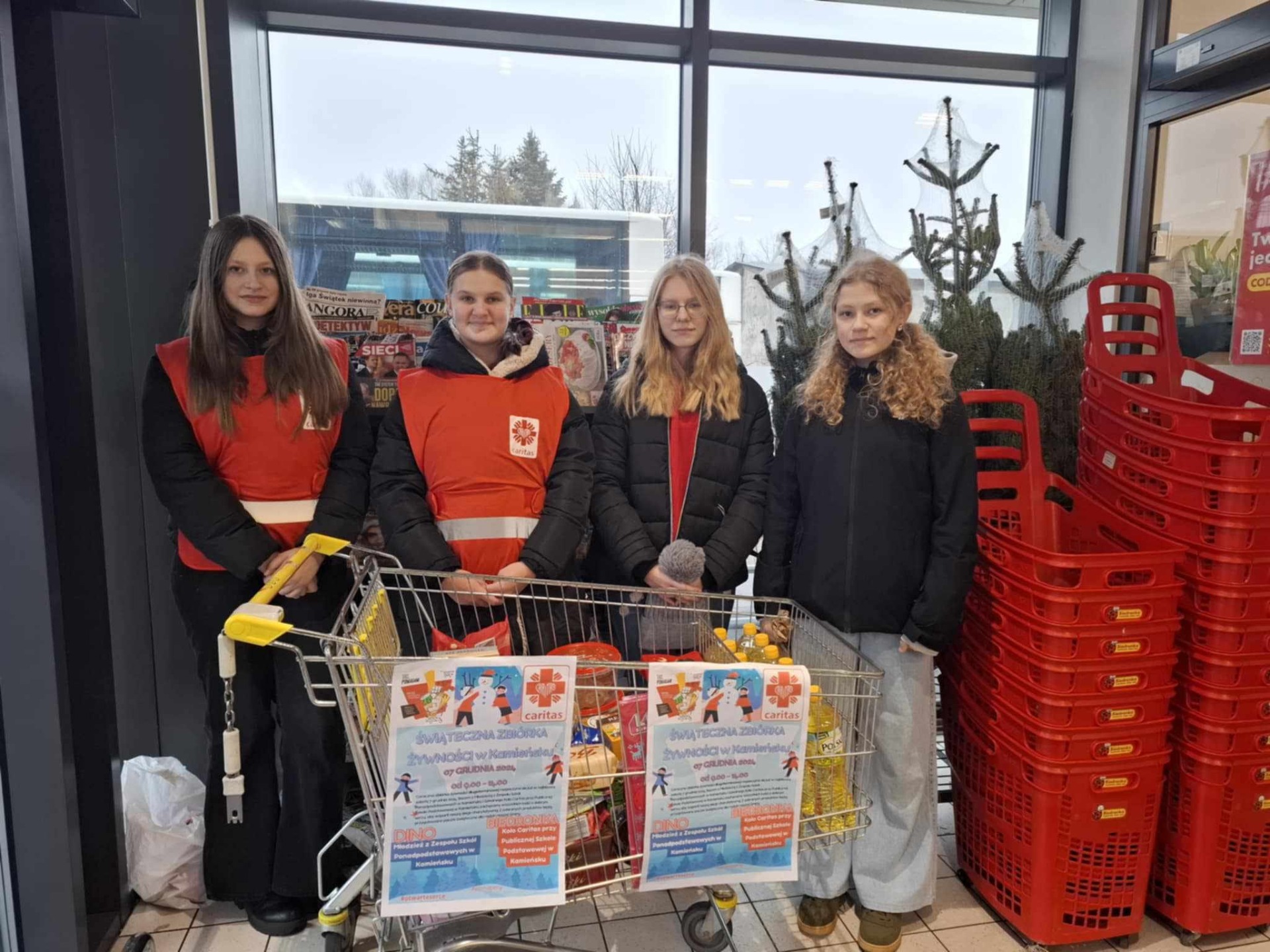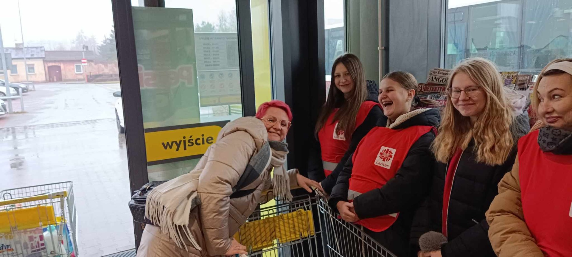 wraz z nauczycielami : p. Anna Baron, p. Renata Trzepańska i KS. Paweł Bil zbierała żywność i produkty długoterminowe przy markecie DINO w Kamieńsku.