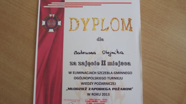 Spośród uczniów Publicznej Szkoły Podstawowej w Kamieńsku , najlepszą znajomością przepisów przeciwpożarowych, zasad postępowania na wypadek pożaru, praktycznych umiejętności posługiwania się podręcznym sprzętem gaśniczym, wiedzą na temat techniki pożarniczej, organizacji ochrony przeciwpożarowej wykazał się Mateusz Olejnik uczeń klasy Vb, który zajął II miejsce wśród uczniów szkół podstawowych naszej gminy. Koordynatorem konkursu w naszej szkole była p. Lidia Piekarska.