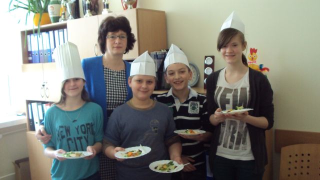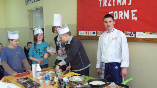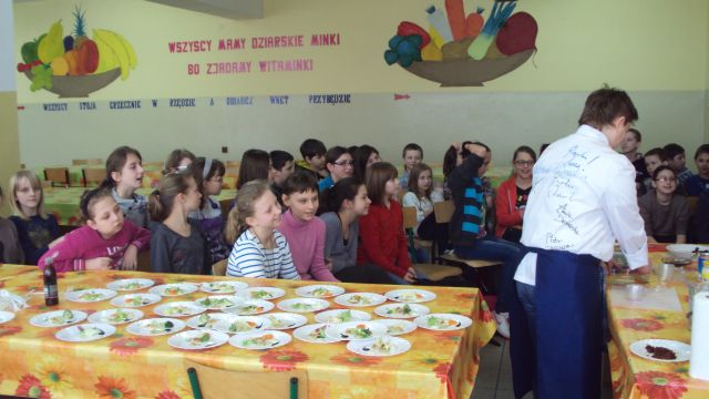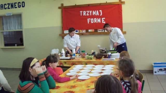 Zaproszeni kucharze w osobach: p.Izabela Sowińska i p.Piotr Kacperek zaprezentowali uczniom sposób zdrowego przyrządzania posiłków. Akcja miała na celu rozpropagowanie wśród uczniów zasad zdrowego odżywiania oraz kultury spożywania posiłków.