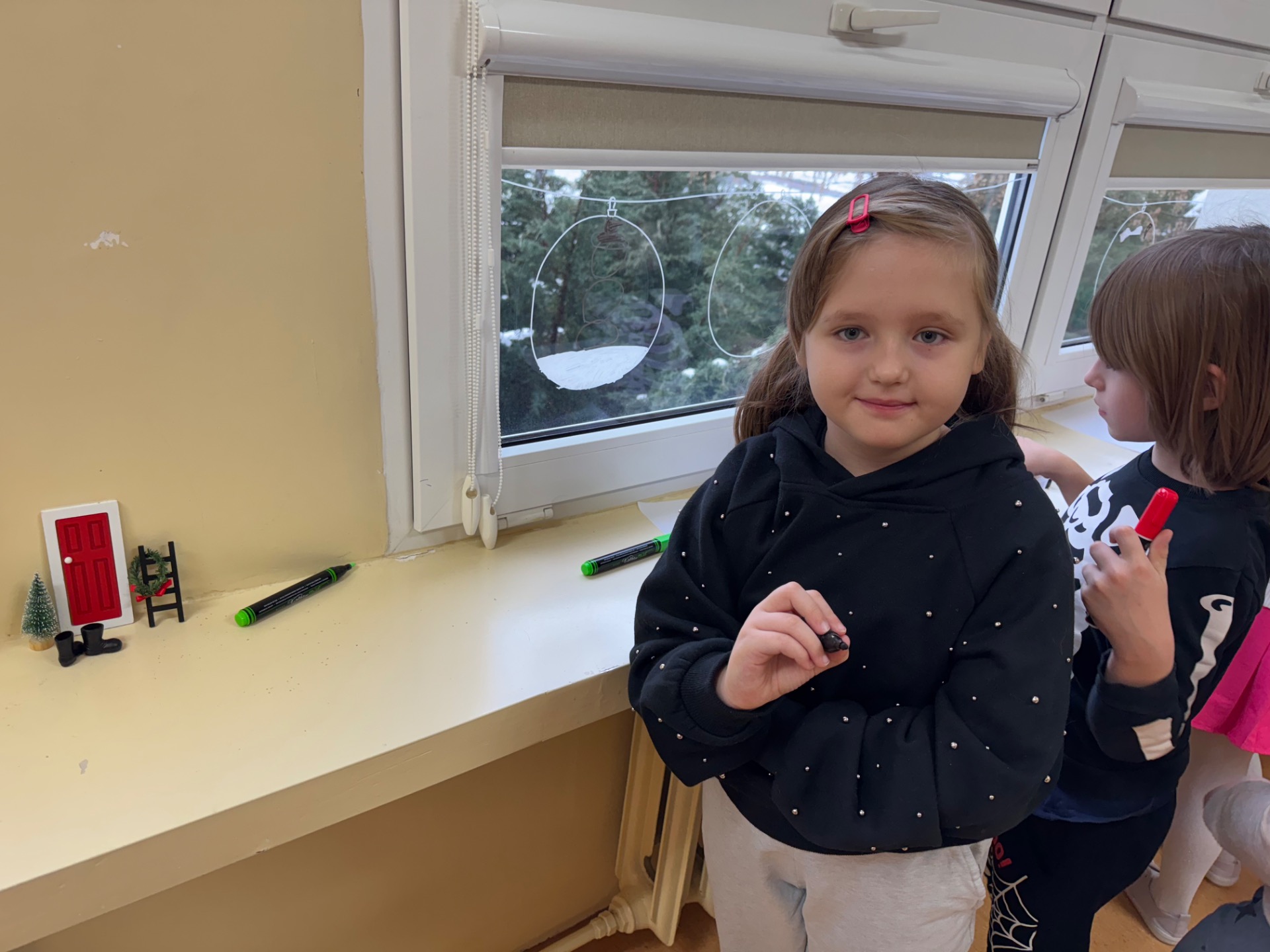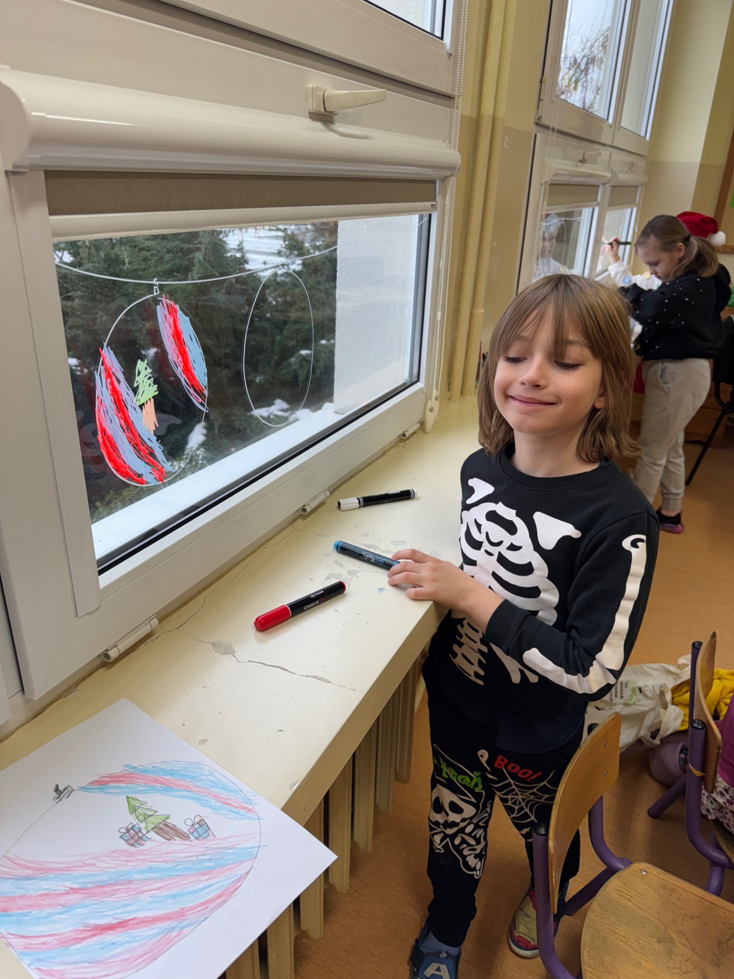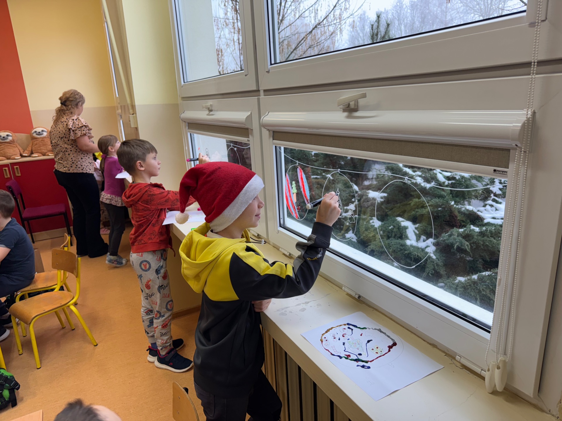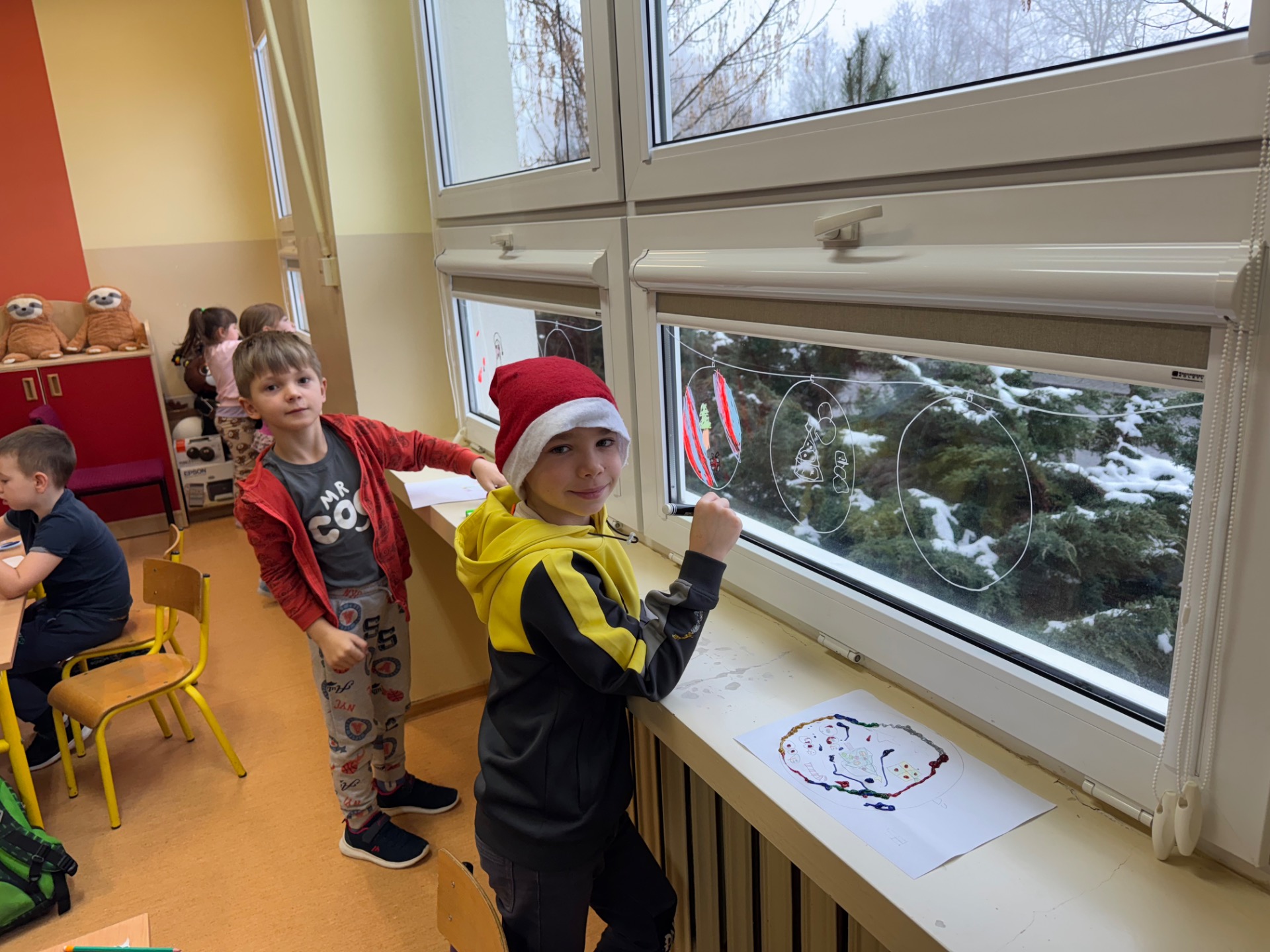 W klasie 1b magia działa na najwyższych obrotach! Pani Ola wraz z uczniami ozdabiała okna tak intensywnie, że mazaki zaczęły się zastanawiać, czy nie przysługuje im urlop. Rysunki wyszły tak piękne, że gdyby Mikołaj miał Facebooka, to pewnie nagrałby z nimi filmik z filtrem „śnieżna magia”.