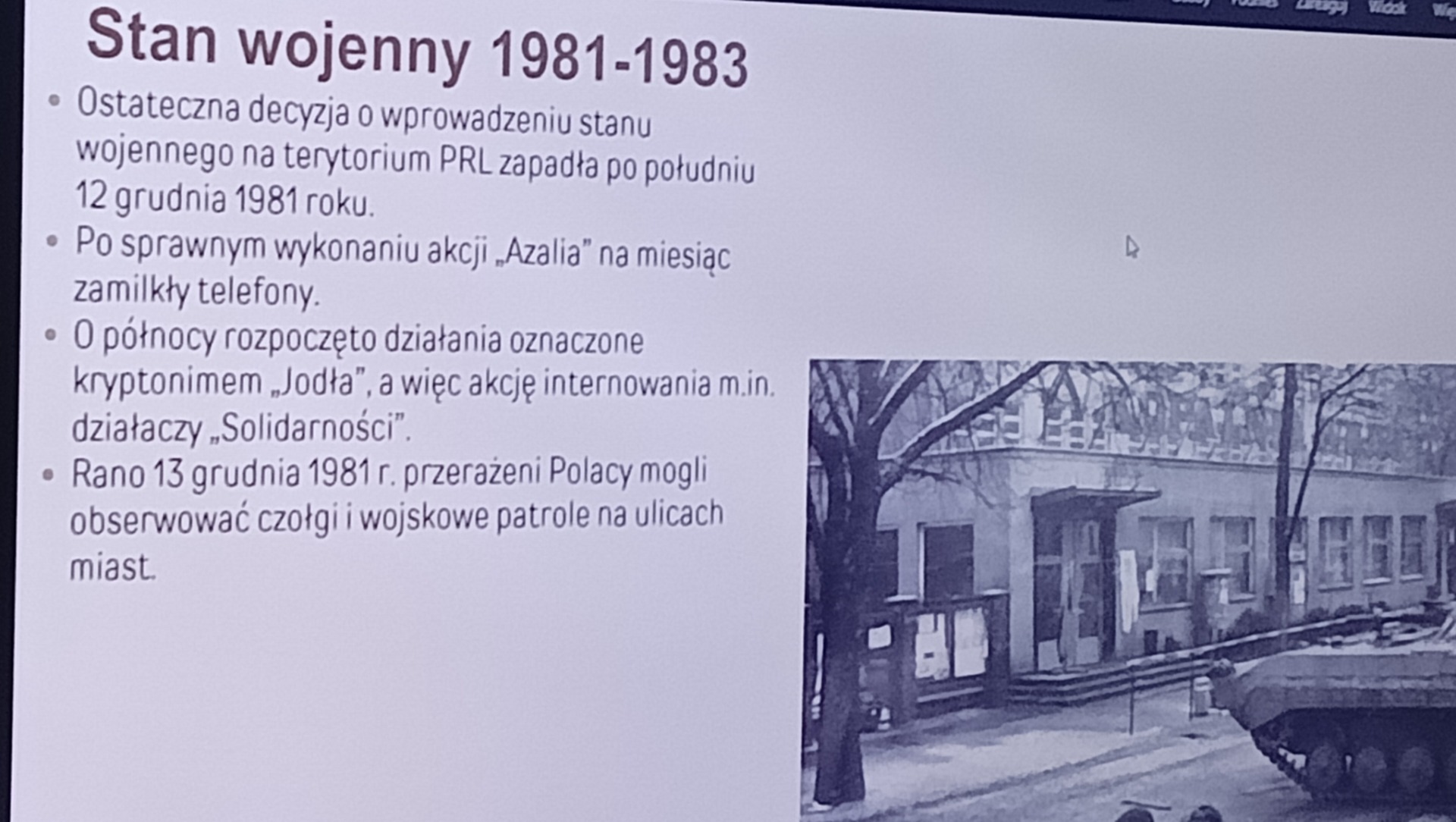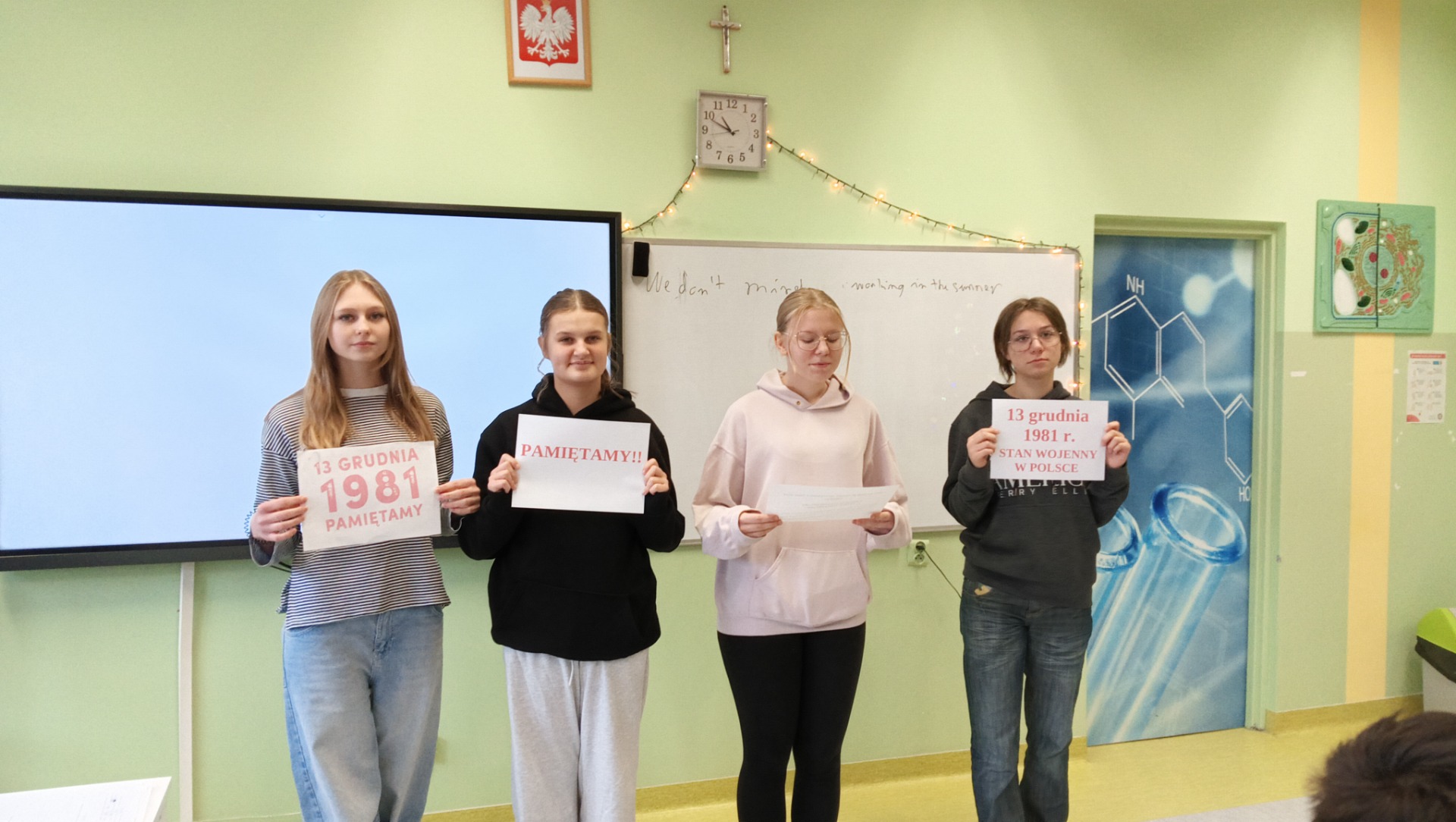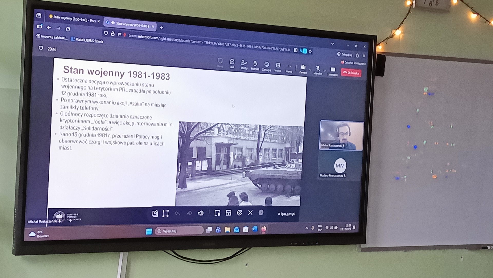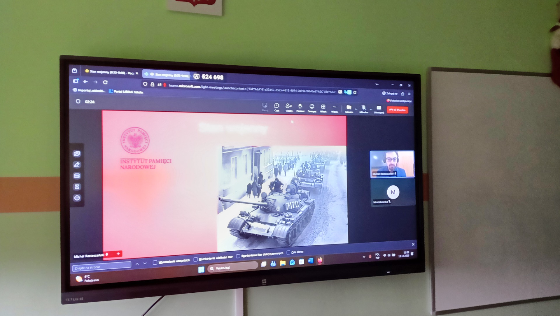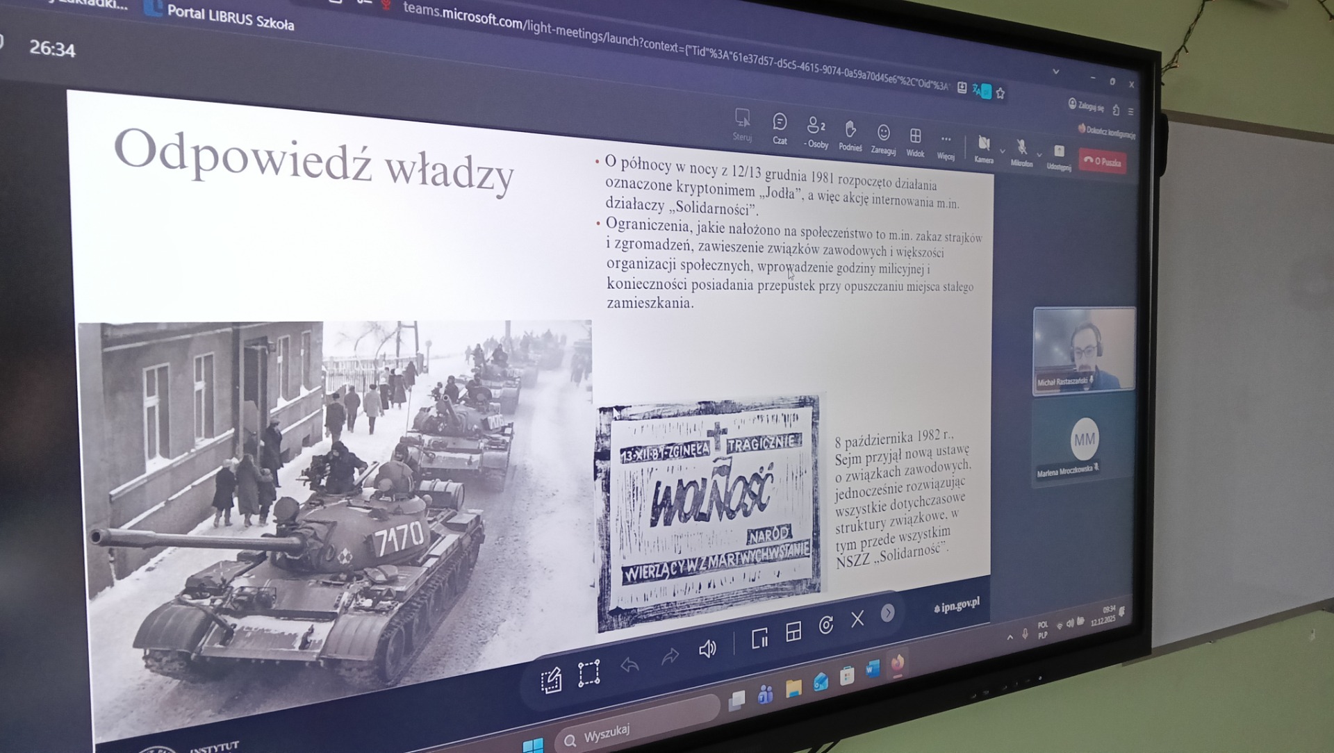 W piątek 12 grudnia uczniowie klas ósmych uczestniczyli w lekcji online przygotowanej przez Centralny Przystanek Historii IPN na temat stanu wojennego w Polsce. Zajęcia przeprowadził pan Michał Rastaszański. Prowadzący przybliżył uczniom kulisy przygotowania i wprowadzenia stanu wojennego w Polsce 13 grudnia 1981 roku. W trakcie spotkania gość wyjaśniał przyczyny stanu wojennego, opowiadał o działaniach władz w nowej rzeczywistości w związku z powstaniem NSZZ "Solidarność" pomiędzy sierpniem 1980 a grudniem 1981 roku. W trakcie wykładu przypomniano o ofiarach stanu wojennego, o działaniach wojska i milicji obywatelskiej po 13 grudnia, a szczególnie o tragicznych wydarzeniach w związku z pacyfikacją kopalni węgla kamiennego "Wujek" w Katowicach 16 grudnia 1981 roku. W trakcie lekcji ukazano stan wojenny nie tylko z perspektywy działaczy ,,Solidarności” oraz opozycji demokratycznej, ale zwykłych osób, które musiały się zmagać z rygorami w sferze życia codziennego. Ponadto uczniowie klasy VIII b, wędrując po klasach, prezentowali informacje na temat stanu wojennego. Obchody przygotowali nauczyciele historii.
