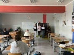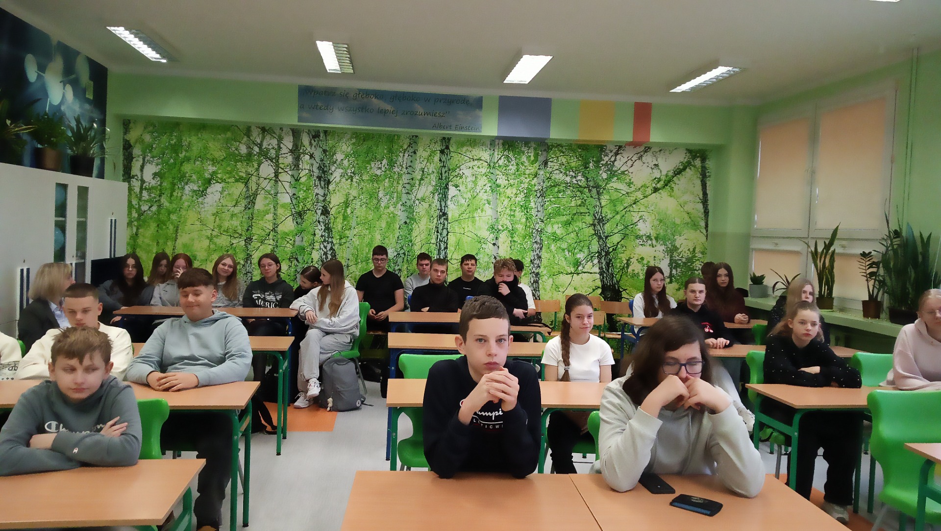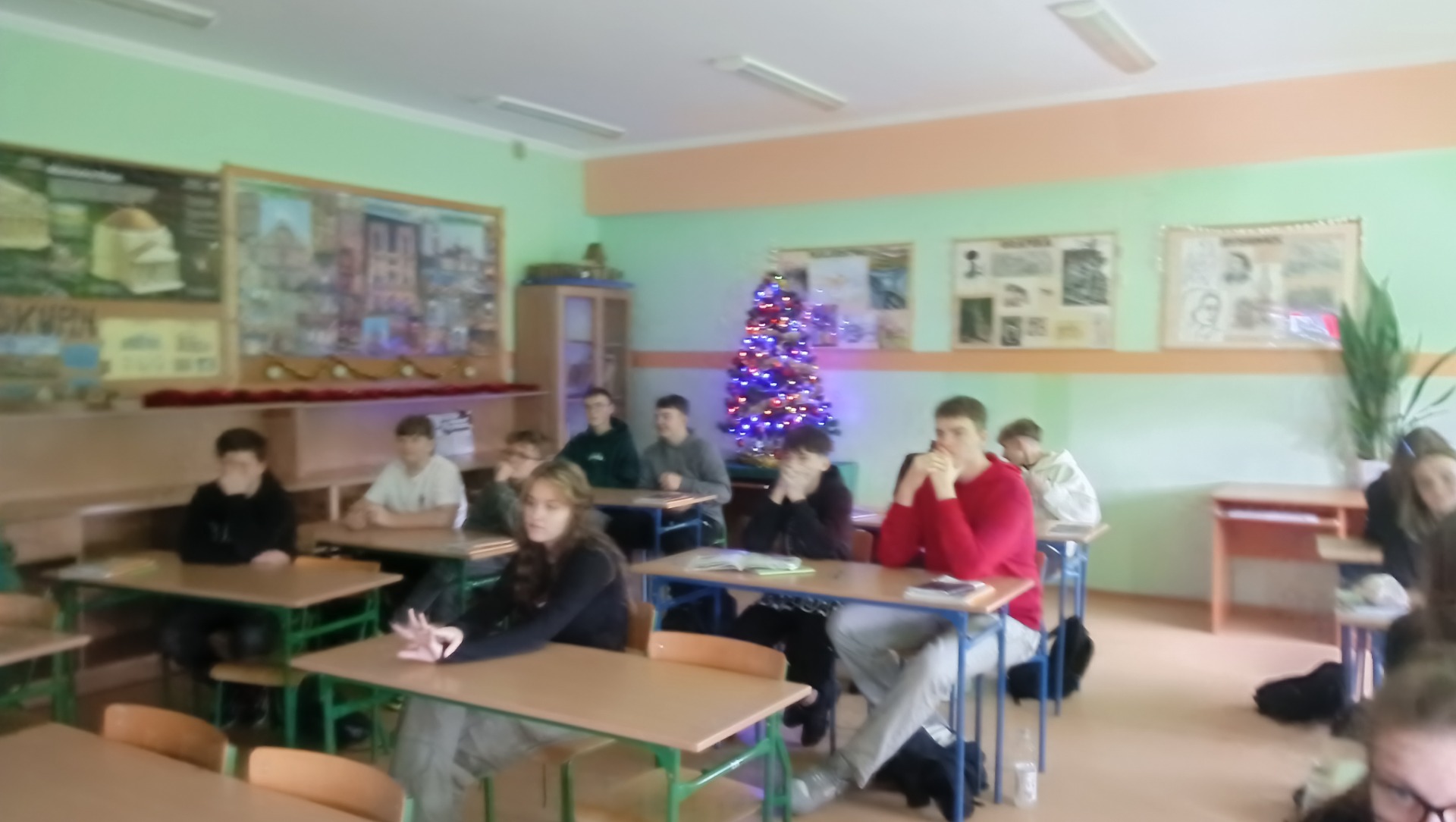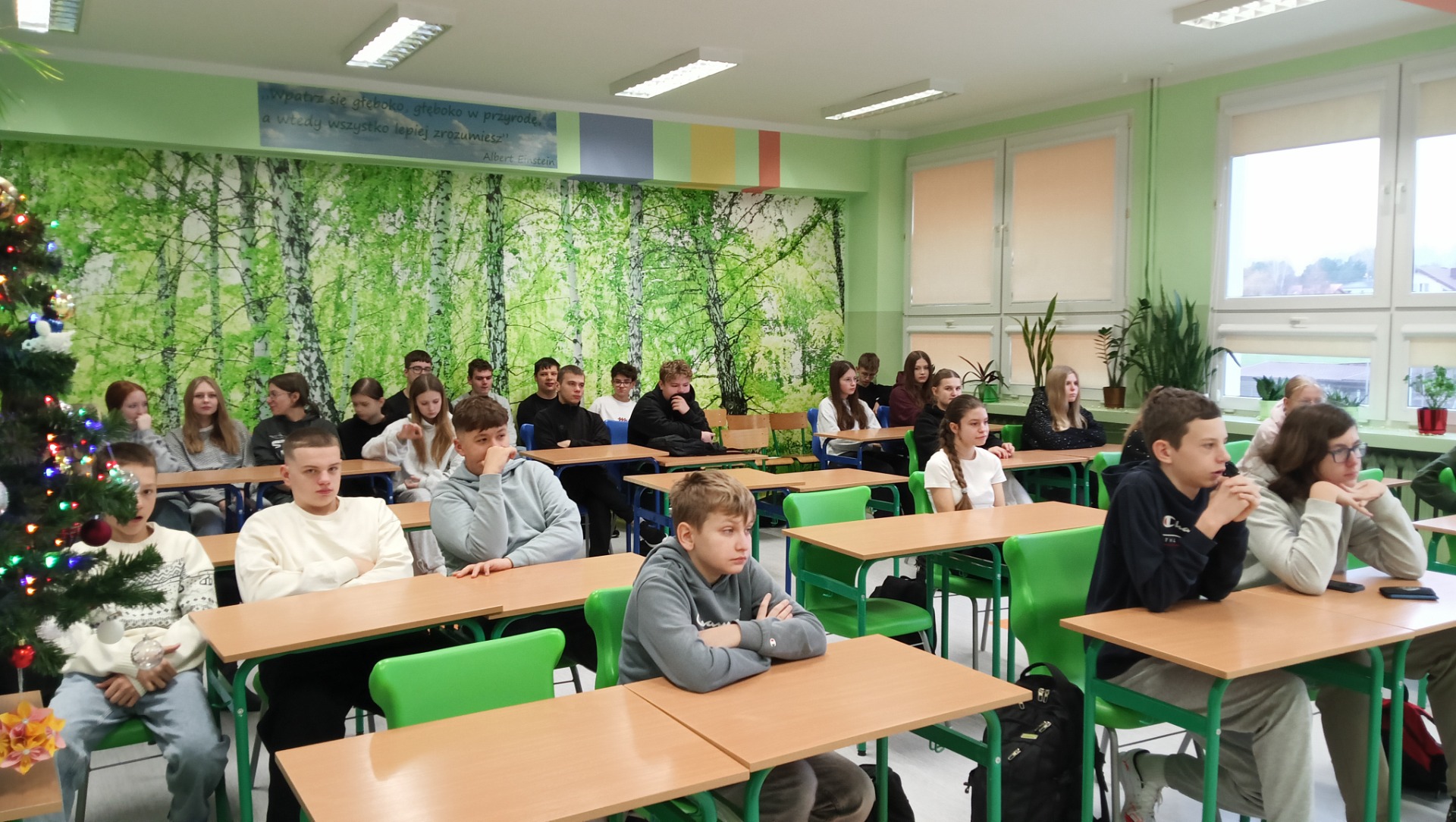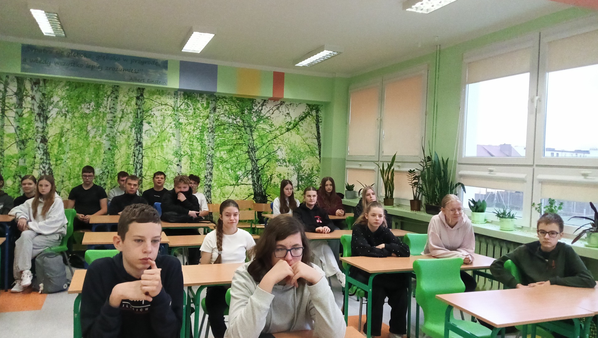W piątek 12 grudnia uczniowie klas ósmych uczestniczyli w lekcji online przygotowanej przez Centralny Przystanek Historii IPN na temat stanu wojennego w Polsce. Zajęcia przeprowadził pan Michał Rastaszański. Prowadzący przybliżył uczniom kulisy przygotowania i wprowadzenia stanu wojennego w Polsce 13 grudnia 1981 roku. W trakcie spotkania gość wyjaśniał przyczyny stanu wojennego, opowiadał o działaniach władz w nowej rzeczywistości w związku z powstaniem NSZZ "Solidarność" pomiędzy sierpniem 1980 a grudniem 1981 roku. W trakcie wykładu przypomniano o ofiarach stanu wojennego, o działaniach wojska i milicji obywatelskiej po 13 grudnia, a szczególnie o tragicznych wydarzeniach w związku z pacyfikacją kopalni węgla kamiennego "Wujek" w Katowicach 16 grudnia 1981 roku. W trakcie lekcji ukazano stan wojenny nie tylko z perspektywy działaczy ,,Solidarności” oraz opozycji demokratycznej, ale zwykłych osób, które musiały się zmagać z rygorami w sferze życia codziennego. Ponadto uczniowie klasy VIII b, wędrując po klasach, prezentowali informacje na temat stanu wojennego. Obchody przygotowali nauczyciele historii.
