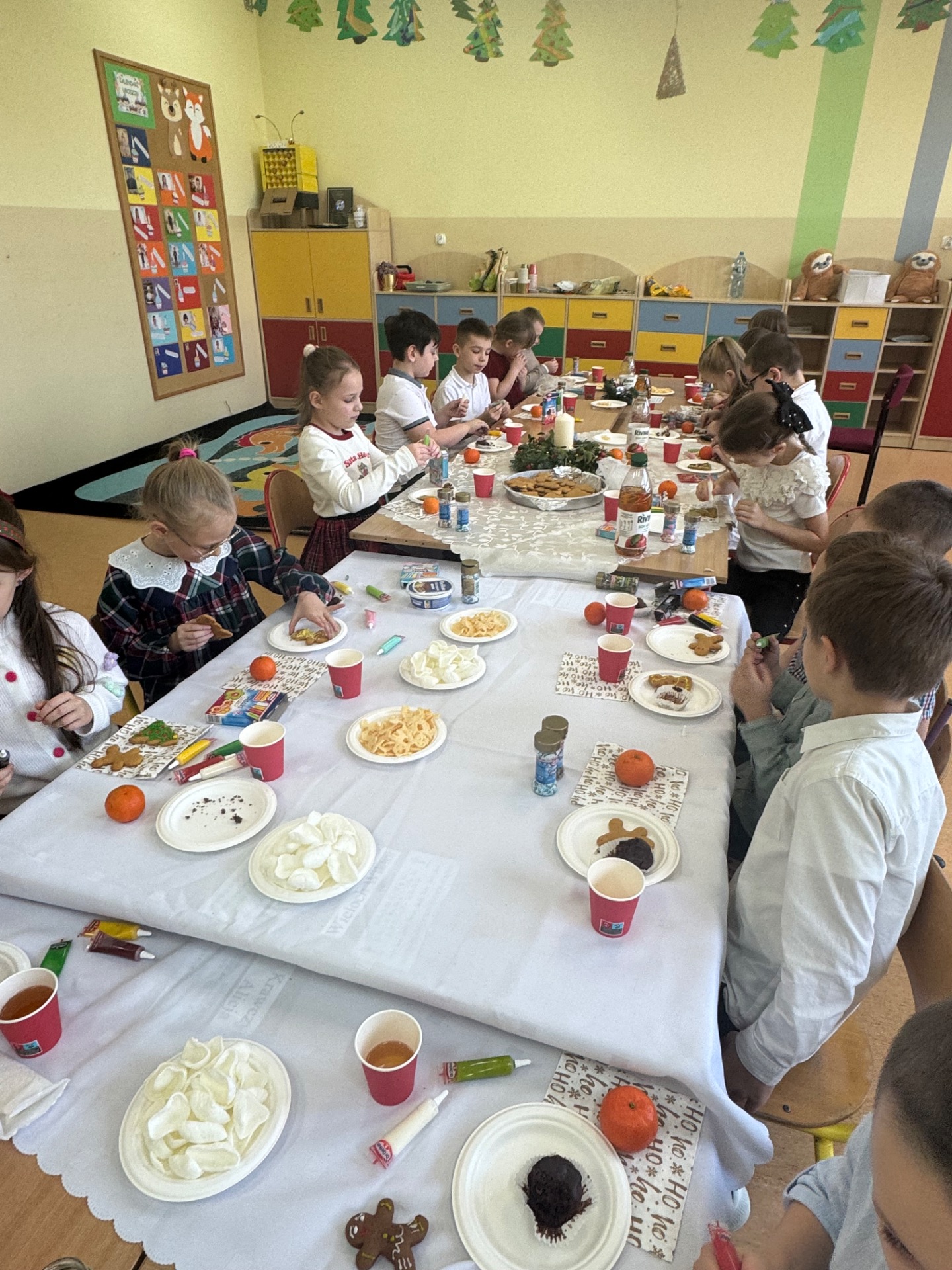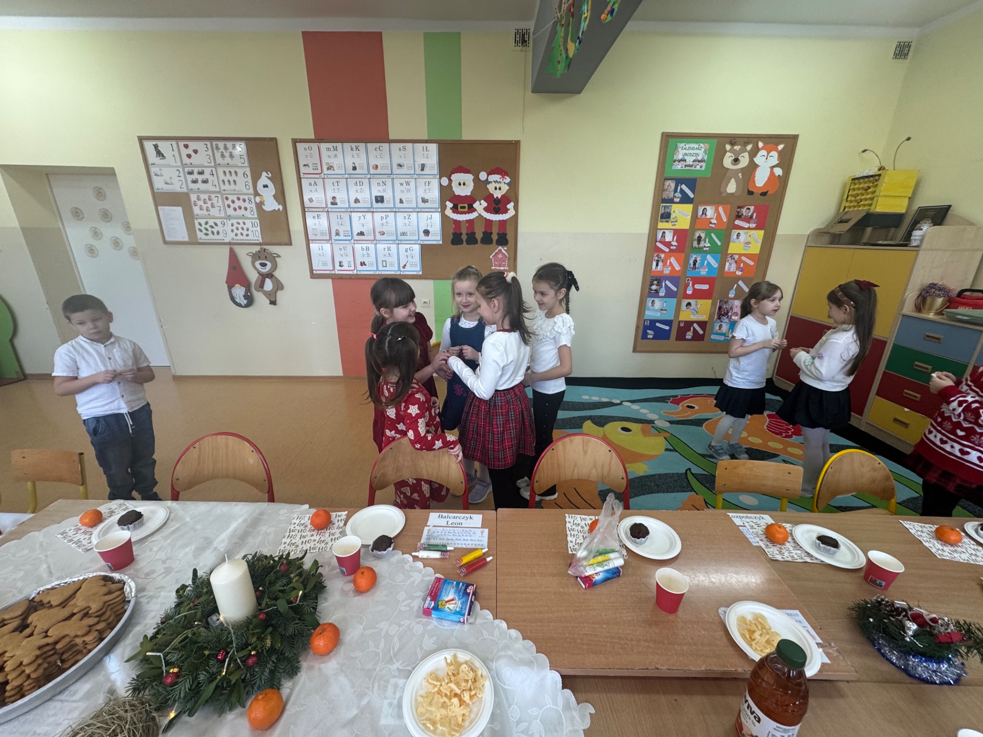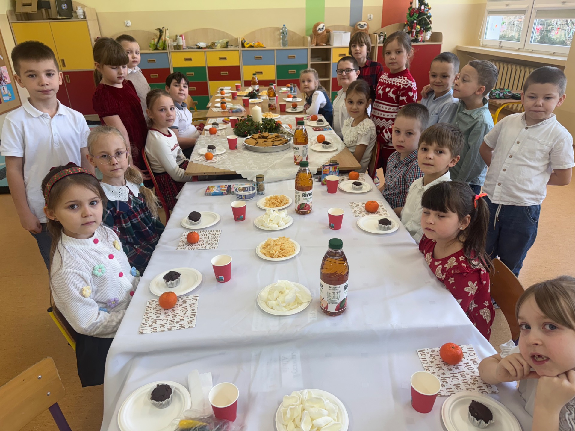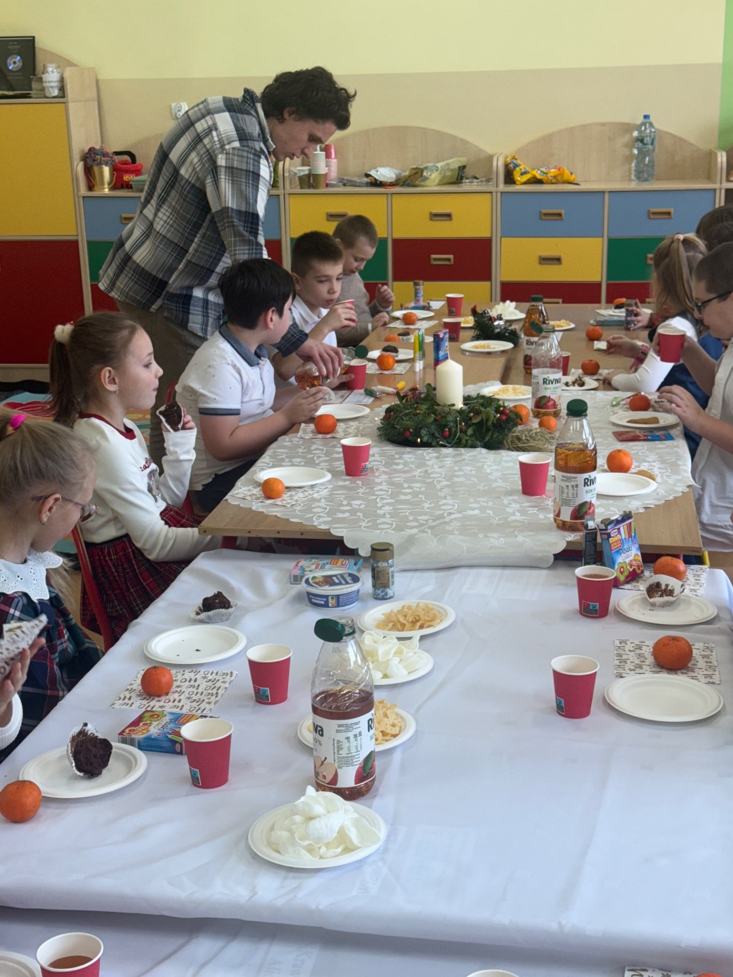 Dzięki zaangażowaniu Rodziców powstały piękne, świąteczne stoły wigilijne, przy których dzieci mogły wspólnie zasiąść, dzielić się opłatkiem i składać sobie życzenia. Był to niezwykle wzruszający moment, pełen serdeczności, bliskości i wzajemnej życzliwości.