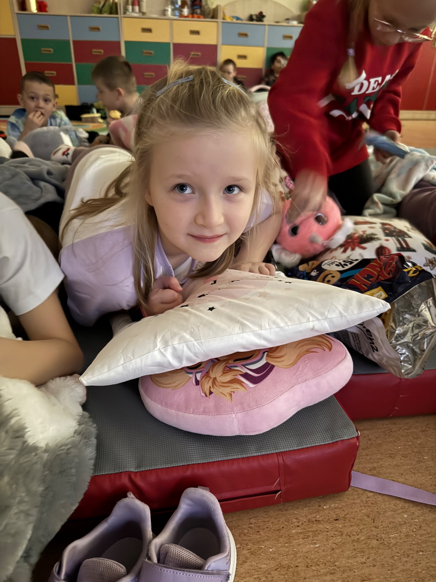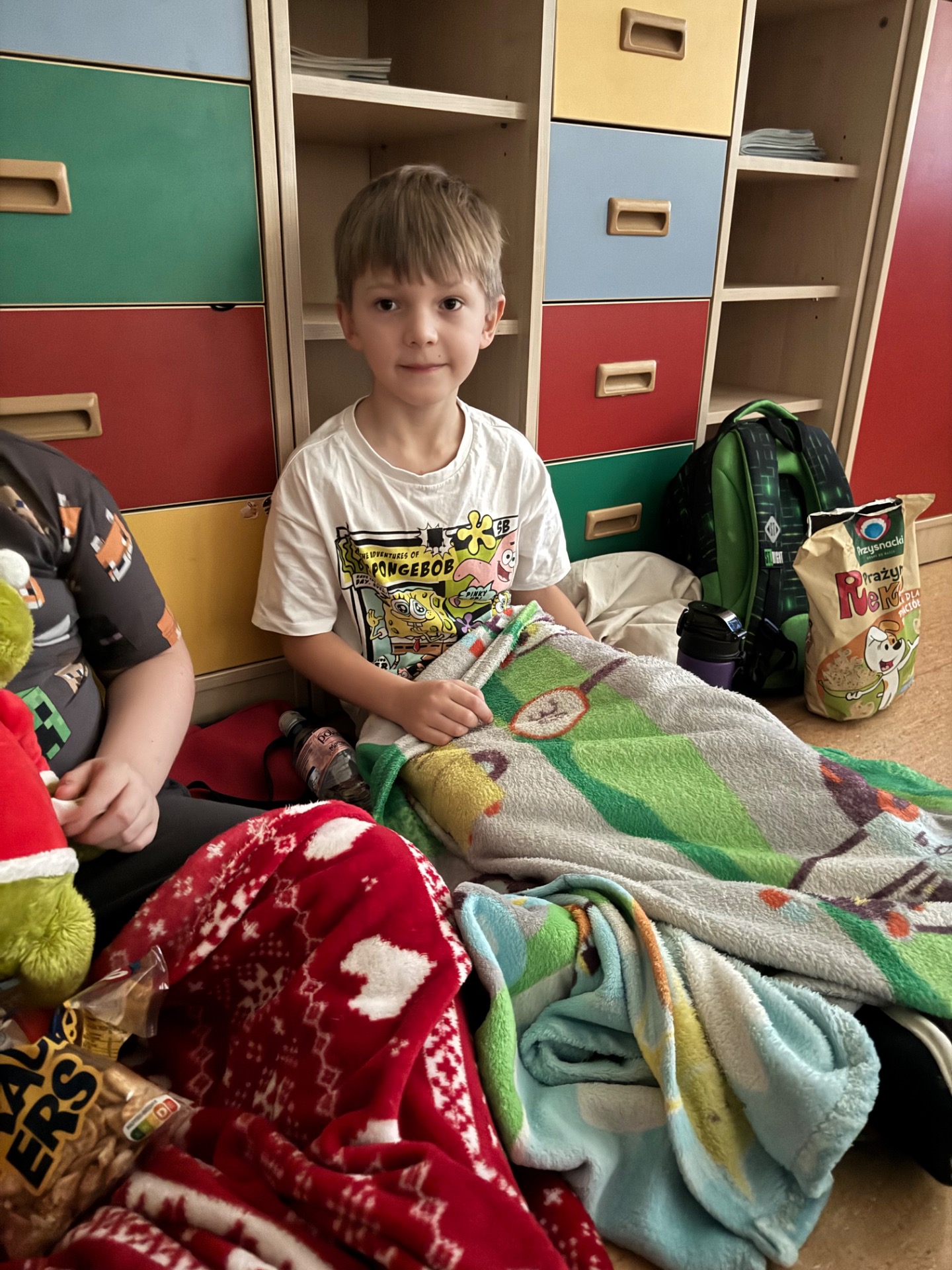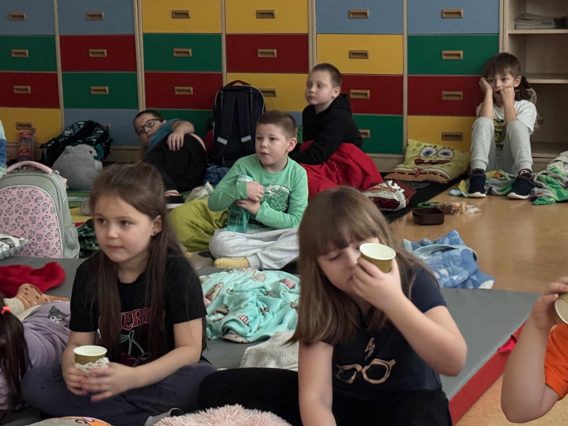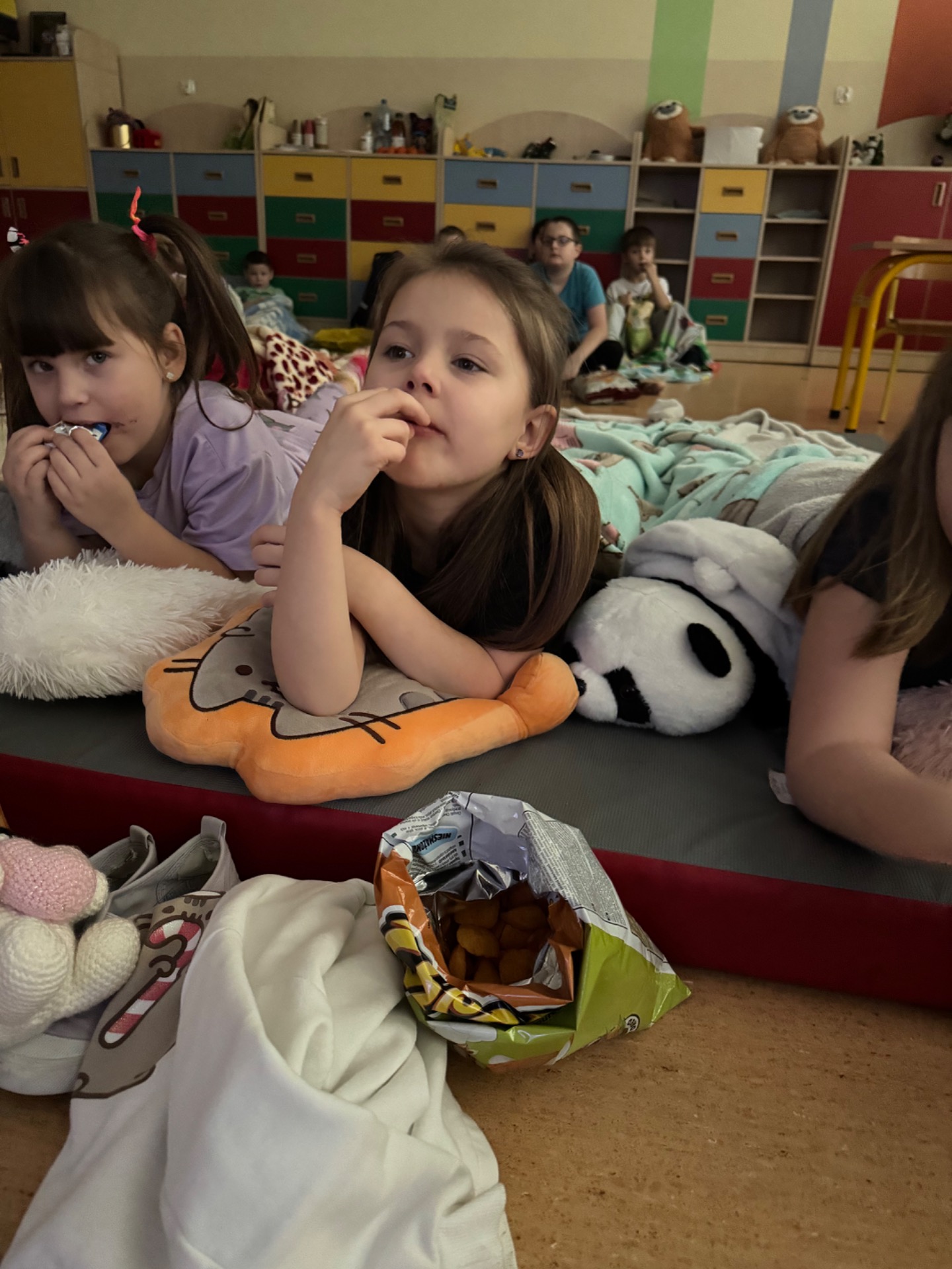 Uczniowie klasy 1b rozpoczęli przerwę świąteczną w najlepszy możliwy sposób – wspólnie oglądając bajkę, integrując się i testując, czy popcorn smakuje lepiej spod kocyka czy z poduszki 🍿🛋️