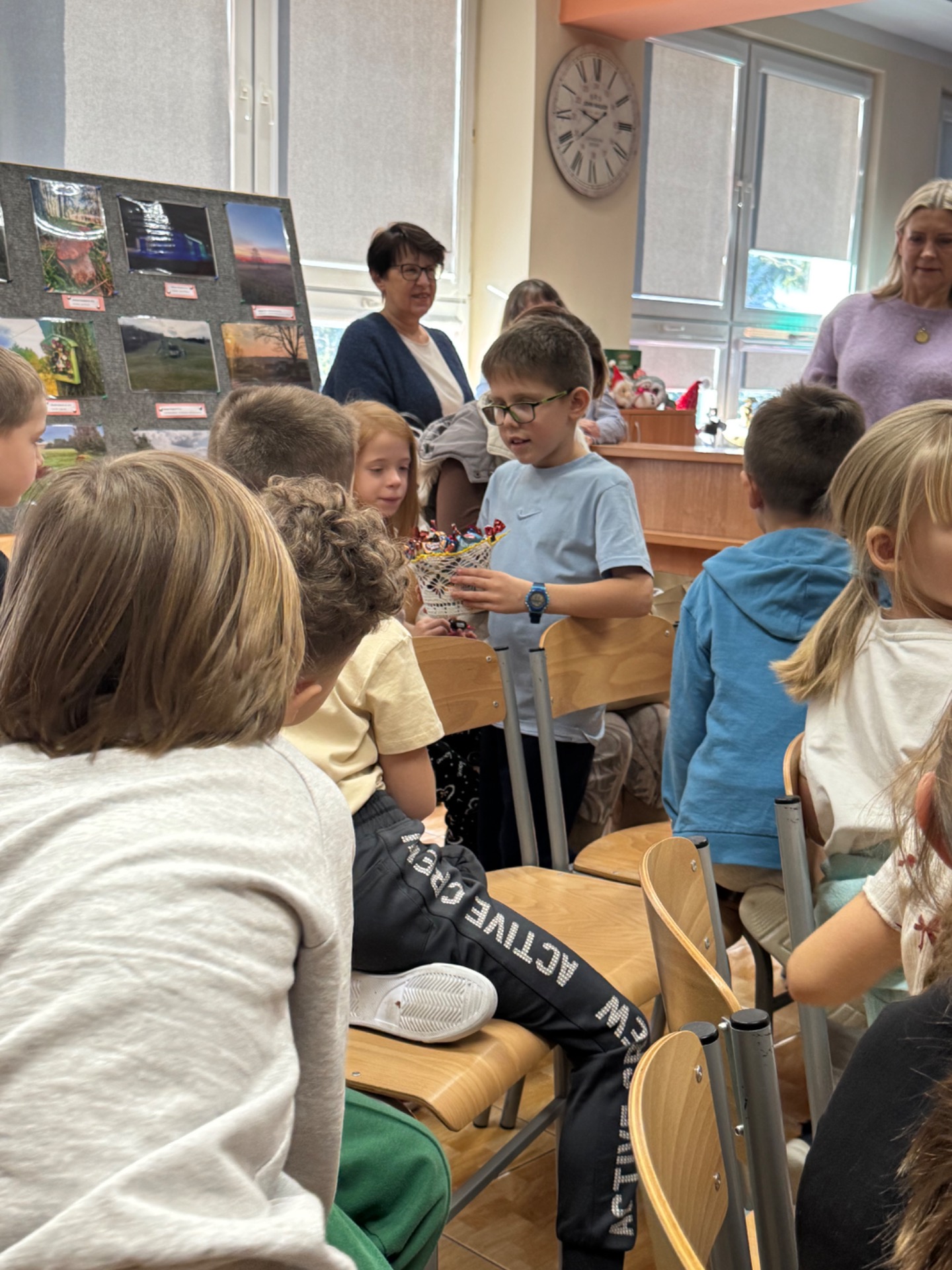 Nasze zaproszenie do udziału w przedsięwzięciu przyjęła pani Joanna Krawczyk- babcia ucznia klasy I a. Pierwszoklasiści z zadowoleniem powitali gościa, chętnie też rozmawiali o swoich babciach i sami wybrali książki , których chcieliby posłuchać. Ich wybór okazał się trafny, bo z zaciekawieniem i uwagą słuchali głośnego czytania pani Joanny o przygodach książkowych bohaterów, za co nasz gość obdarował ich słodkościami. Dzieci podziękowały a na zakończenie z ochotą pozowały do wspólnej fotografii.