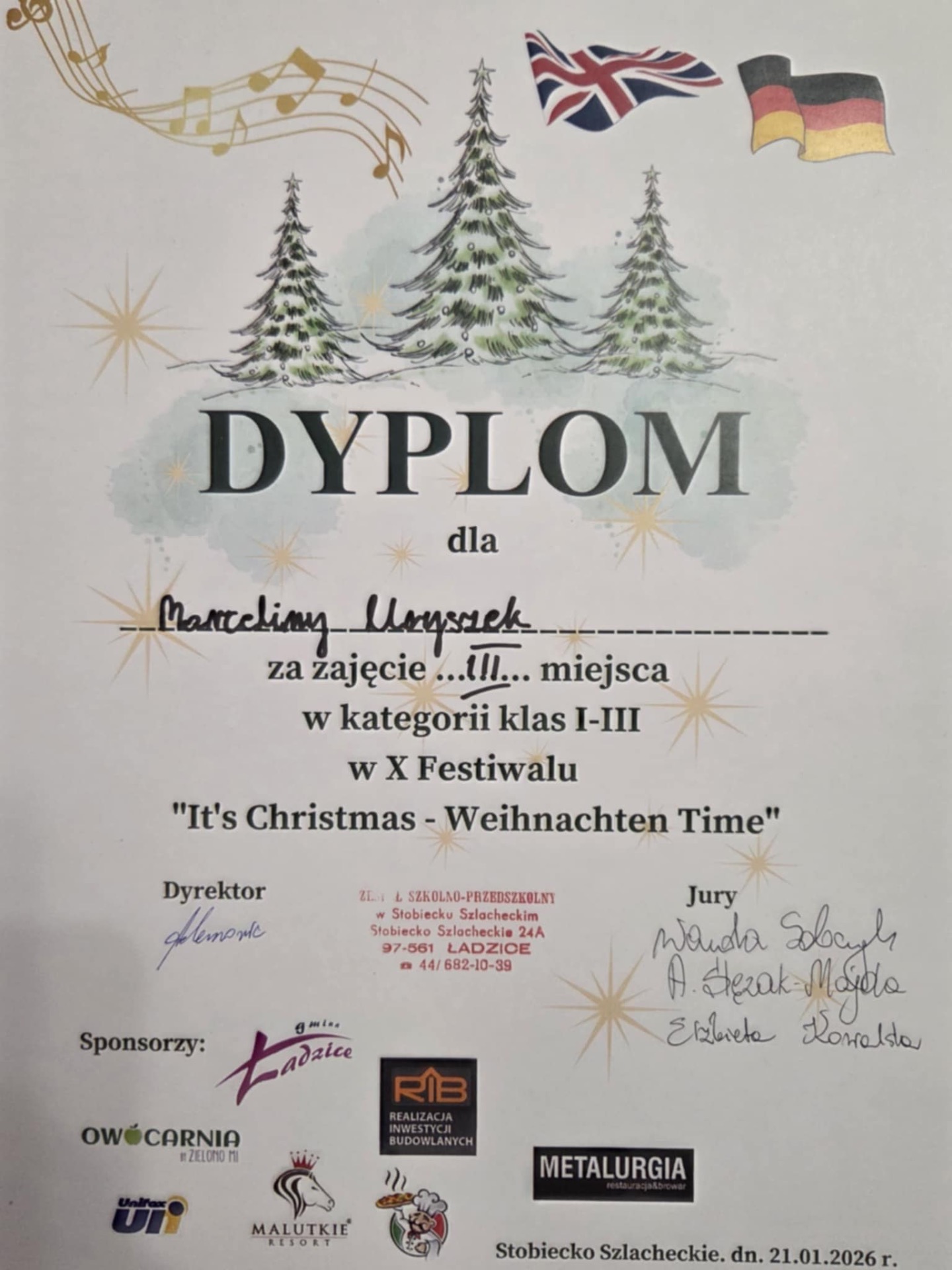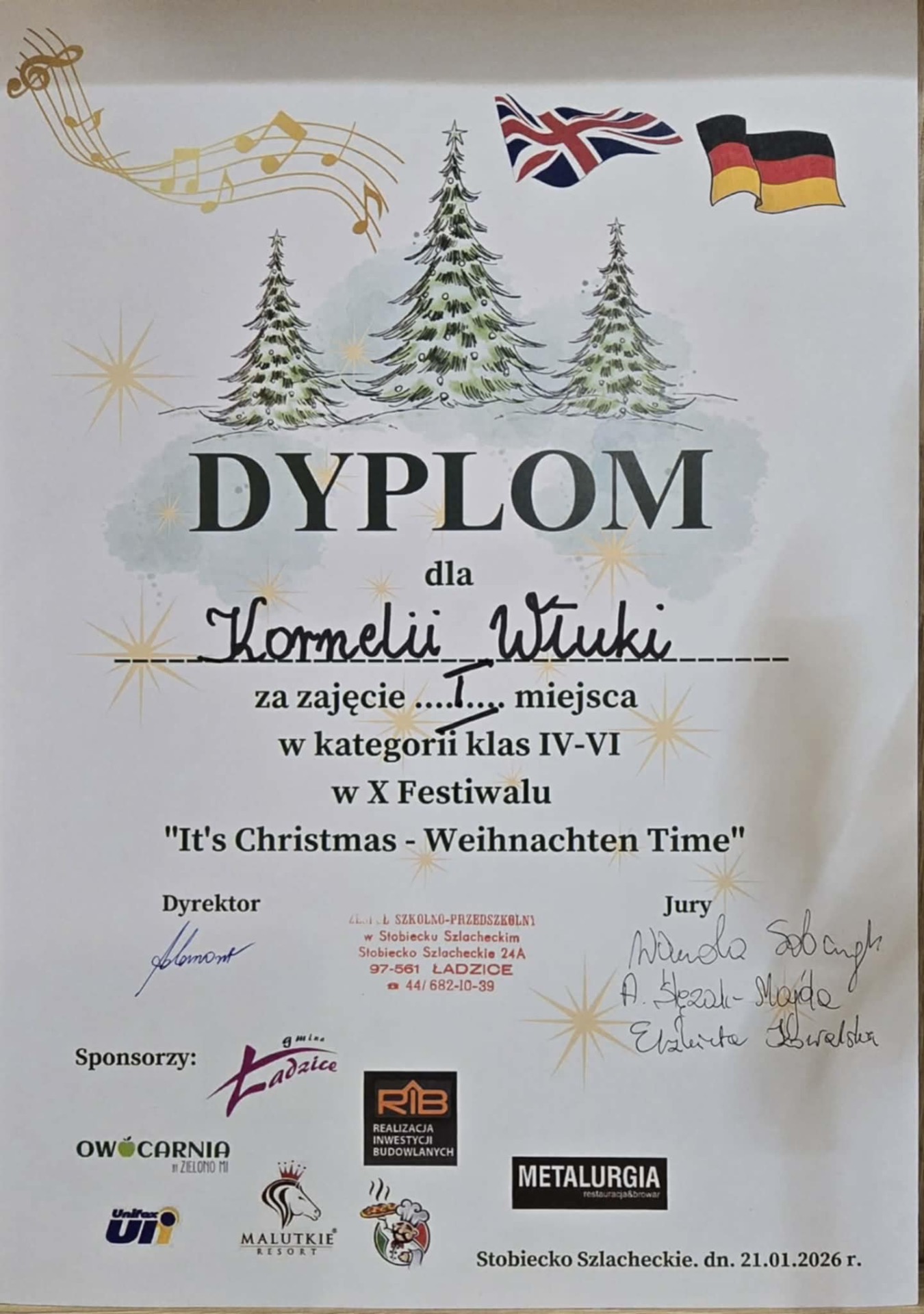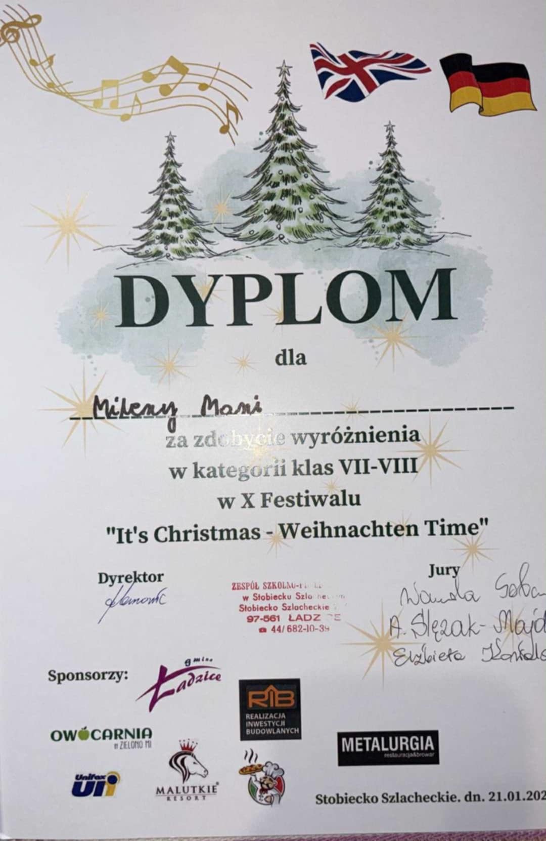 21 stycznia 2026r. w ZS-P w Stobiecku Szlacheckim nasze uczennice pokazały swój talent wokalno - językowy śpiewając piosenki świąteczne w języku angielskim. Komisja konkursowa nagrodziła je przyznając: