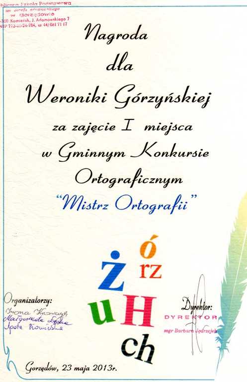 Dnia 23 maja 2013 roku w Zespole Szkolno-Przedszkolnym w Gorzędowie odbył się II etap Gminnego Konkursu Ortograficznego dla klas III. Uczestniczyli w nim uczniowie dwóch szkół, którzy zostali wyłonieni po I etapie. Z naszej szkoły wzięli udział: Sandra Dworzyńska, Marta Gąciarek, Aleksandra Głowacka, Weronika Górzyńska, Weronika Jureńczyk, Edyta Kenigsman, Artur Klekociński, Aleksandra Pawlik, Natalia Sewerynek, Małgorzata Stępień