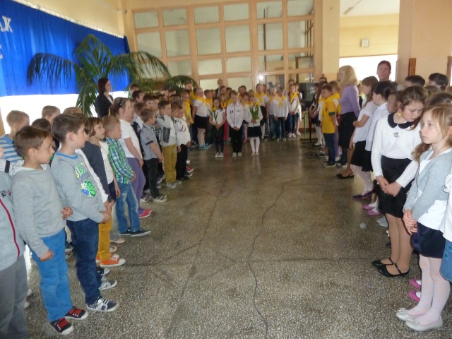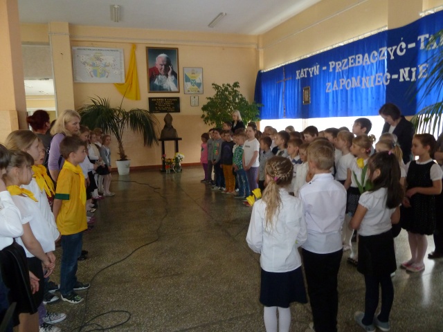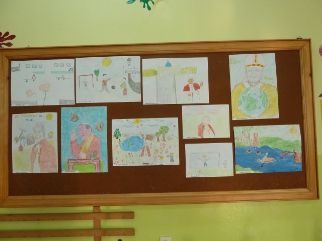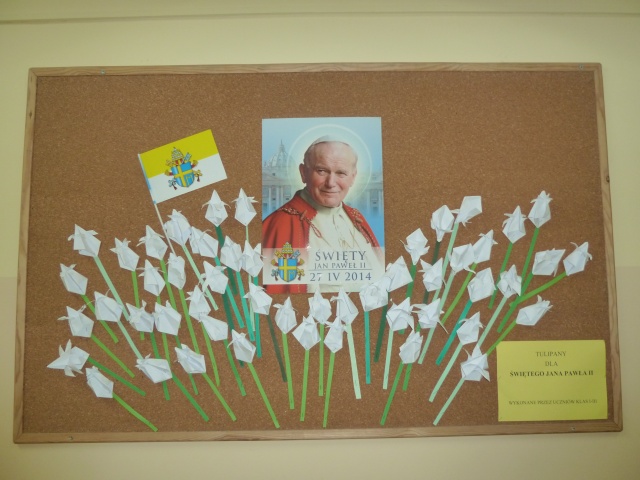 W dalszym ciągu tego wyjątkowego dnia uczniowie klas młodszych wykonywali prace plastyczne, malowali kolorowanki oraz wykonali tulipany metodą składania papieru dla Świętego Jana Pawła II, które zostały umieszczone na tablicy, w holu na parterze. Następnie wszyscy uczniowie w galowych strojach spotkali się na apelu. Przy wspólnym śpiewie "Barki" najmłodsi uczniowie złożyli kwiaty przed popiersiem patrona szkoły. Z pewnością ten dzień na długo pozostanie w pamięci naszych uczniów, świadków jednego z najbardziej doniosłego i uroczystego wydarzenia dla naszego Narodu, stanowiącego zwieńczenie wielkiego pontyfikatu - kanonizacji Jana Pawła II, Patrona Szkoły, Honorowego Obywatela Miasta i Gminy Kamieńsk oraz Patrona Rodzin.