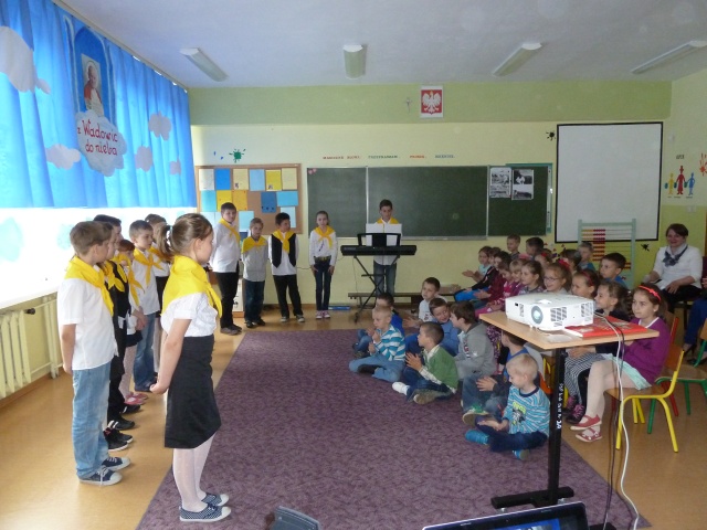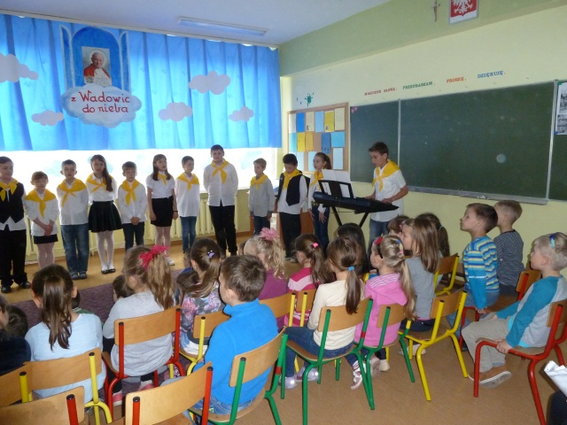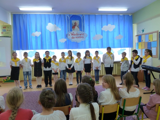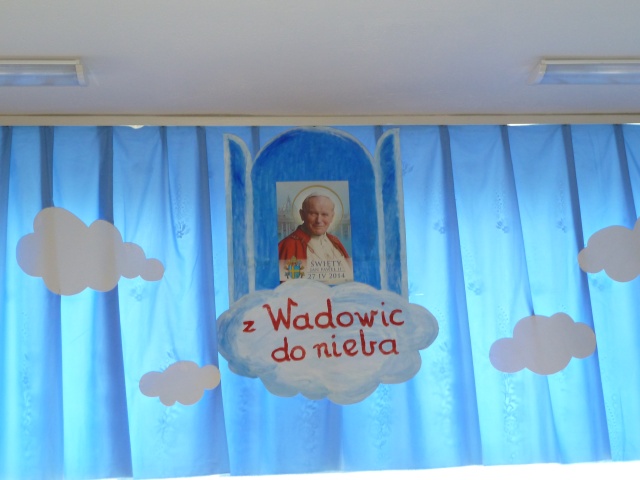 Dzień 28 kwietnia 2014 roku był wyjątkowy dla uczniów klas I-III. Dla uczczenia kanonizacji Jana Pawła II uczniowie wraz z nauczycielkami obejrzeli występ wzbogacony prezentacją multimedialną pt. "Z Wadowic do nieba" przygotowany przez uczniów klasy IIIC pod kierunkiem wychowawczyni. Zaprezentowana, ciepła i wzruszająca historia życia Ojca Świętego przybliżyła uczniom postać patrona szkoły oraz wprowadziła w podniosły i uroczysty nastrój. Występ starszych koleżanek i kolegów obejrzała także grupa dzieci z przedszkola, która odwiedziła naszą szkołę wraz z wychowawczynią. Po obejrzeniu występu przedszkolaki zaprezentowały kilka pięknych, nagrodzonych wielkimi brawami, piosenek z elementami tańca, przygotowanych z okazji kanonizacji Jana Pawła II.