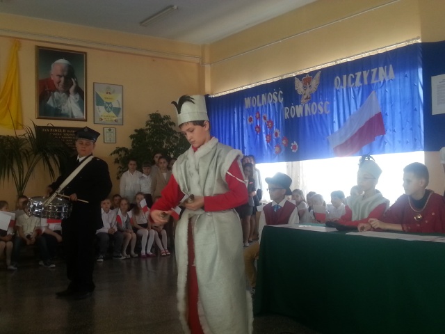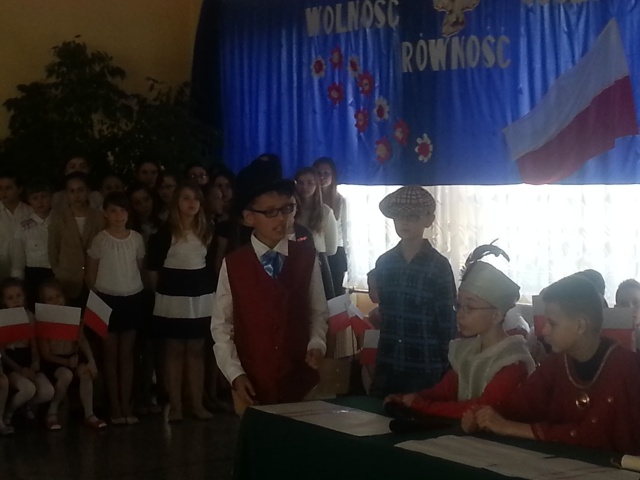 Uroczystość rozpoczęto wspólnym odśpiewaniem Hymnu Polski. Następnie przypomniano historię, w której rozegrało się to ważne wydarzenie w dziejach Polski. Ciekawą formą przybliżenia młodym widzom sensu obchodów tego święta, była przedstawiona scenka, w której uczniowie zaprezentowali swoje umiejętności aktorskie. Wcielili się w role postaci historycznych z XVIII wieku, m.in króla Poniatowskiego i marszałka sejmu Stanisława Małachowskiego. Występowali również magnaci i szlachta. Następnie uczniowie wykazali swoje umiejętności wokalne odśpiewując pieśni patriotyczne przygotowane przez chór szkolny pod przewodnictwem p. Marzeny Górnej - Turlejskiej. Oprawę plastyczną uroczystości wykonała p. Lidia Piekarska.